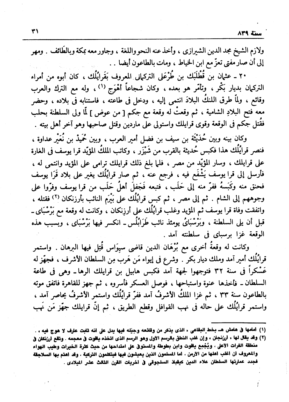 عثمان بن قطلبك بن طرغلي، التركماني المعروف بقرايلوك، كان أبوه من أمراء التركمان بديار بكر وتأمر هو بعده، وكان شجاعاً أهوج، وله مع الترك والعرب وقائع، ولما طرق اللنك البلاد انتمى إليه، ودخل في طاعته فاستنابه في بلاده، وحضر معه فتح البلاد الشامية، ووقعت له وقعة مع جكم لما ولي السلطنة بحلب فقتل جكم في الوقعة وقوي قرا يلك واستولى على ماردين وقتل صاحبها وهو آخر أهل بيته، وكان بينه وبين حديثه بن سيف بن فضل أمير العرب، وكانت بينه وبين حميد بن نعير عداوة، فنصر قرا يلك هذا فكبس حديثة بالقرب من شيزر، فكاتب الملك المؤيد قرا يوسف في الغارة على قرا يلك وسار المؤيد من مصر، فلما بلغ ذلك قرا يلك ترامى على المؤيد وانتمى إليه فأرس إلى قرا يوسف فشفع فيه فرجع عنه، ثم صار قرا يلك يغير على بلاد قرا يوسف فخنق منه وكبسه، ففر منه إلى حلب فتبعه، فجفل أهل حلب من قرا يوسف وفروا على وجوههم إلى الشام ثم إلى مصر، ثم كبس قرا يلك على بيرم النائب بأرننكان فقتله، واتفقت وفاة قرا يوسف ثم المؤيد، وغلب قرا يوسف على أرزنكان، وكانت له وقعة مع برسباتي قبل أن يلي السلطنة وبرسباتي يومئذ نائب طرابلس انكسر فيها برسبائي، وبسبب هذه الوقعة غزا برسبائي في سلطنته آمد، وكانت له وقعة أخرى مع برهان الدين قاضي سيواس قتل فيها البرهان، واستمر قرا يلك أميراً مدة وملك الديار ديار بكر، وشرع في إيواء من هرب من السلطان الأشرف فجهز له عسكراً في سنة 32 فتوجهوا لجهة آمد، فكبس هابيل بن قرا يلك وهي في طاعة السلطان فأخذها عنوة واستباحها، فوصل العسكر فأسروه، ثم جهز للقاهرة فاتفق موته بالطاعون سنة 33 ثم غزا الملك الأشرف آمد ففر قرا يلك واستمر الأشرف يحاصر آمد، ثم رجع إلى الديار المصرية واستمر قرا يلك على حاله في نهب القوافل وقطع الطريق، ثم إن قرا يلك جهز من نهب