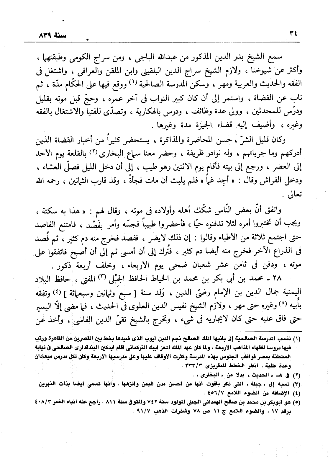 وسمع الشيخ بدر الدين المذكور من عبد الله الباجي ومن السراج الكومي وبطبقتيهما وأكثر عن شيوخنا، ولازم الشيخ سراج الدين البلقيني وابن الملقن والعراقي، واشتغل في الفقه والحديث والعربية ومهر، وسكن المدرسة الصالحية ووقع فيها لي الحكام مدة ثم ناب عن القضاة، واستمر إلى أن كان كثير النواب في آخر عمره، وحج قبل موته بقليل، ودرس للمحدثين في المنصورية، وولي عدة وظائف، ودرس بالكهارية، وتصدى للفتيا وللاشتغال بالفقه وغيره، وأضيف إليه قضاء الجيزة مدة وغيرها، وكان قليل الشر حسن المحاضرة والمذاكرة، يستحضر كثيراً من أخبار القضاة الذين أدركهم وما جرياتهم، وله نوادر ظريفة، حضر معنا سماع الحديث بالقلعة يوم الأحد إلى العصر ورجع إلى بيته فأقام يوم الاثنين وهو طيب إلى أن دخل الليل فصلى العشاء ودخل الفراش فقال: أجد غما، فلم يلبث أن مات فجأة وقد قارب الثمانين - رحمه الله تعالى! واتفق أن بعض الناس شكك أهله وأولاده في موته، وقال لهم: هذا به سكتة ويب أن تختبروا أمره لئلا تدفنوه حياً، فأحضروا طبيباً فجسه وأمر بفصده، فامتنع الفاصد حتى اجتمع ثلاثة من الأطباء وقالوا إن ذلك لا يضر ففصد فخرج منه دم كثير، ثم فصد في الذراع الآخر فخرج منه دم كثير أيضا، فترك إلى أن أمسى ثم إلى أن اصبح فأروح، فاتفقوا على موته، ودفن ثامن عشر شعبان ضحى يوم الأربعاء، وخلف أربعة أولاد ذكور.