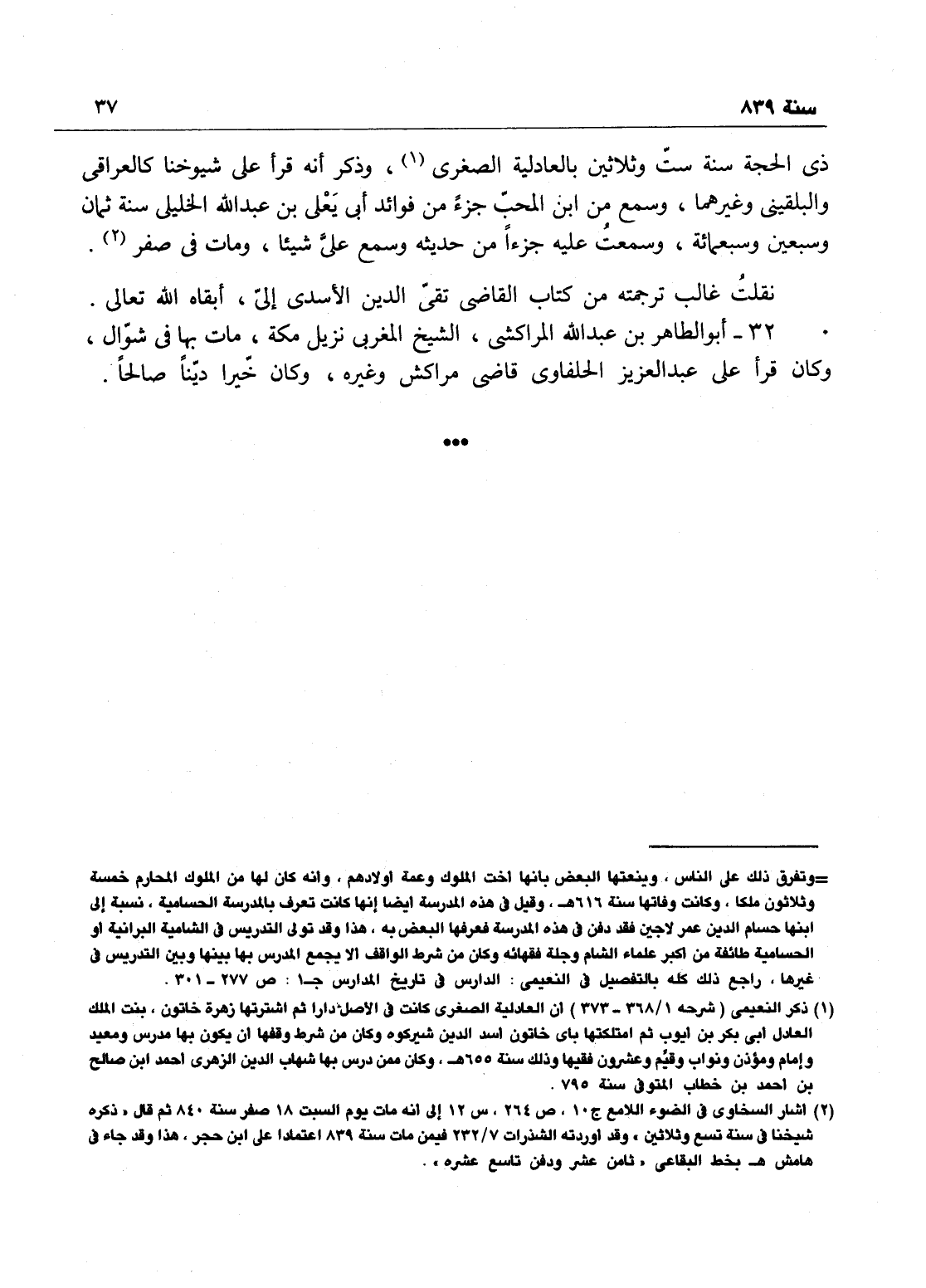 ذي الحجة سنة ست وثلاثين بالعادلية الصغرى، وذكر أنه قرأ على شيوخنا العراقي والبلقيني وغيرهما، وسمع من ابن المحب، وسمعت عليه جزء الخلفاء، من حديثه وسمع على شيئاً ومات في صفر، نقلت غالب ترجمته من كتاب القاضي تقي الدين الأسدي إلي - أبقاه الله تعالى.