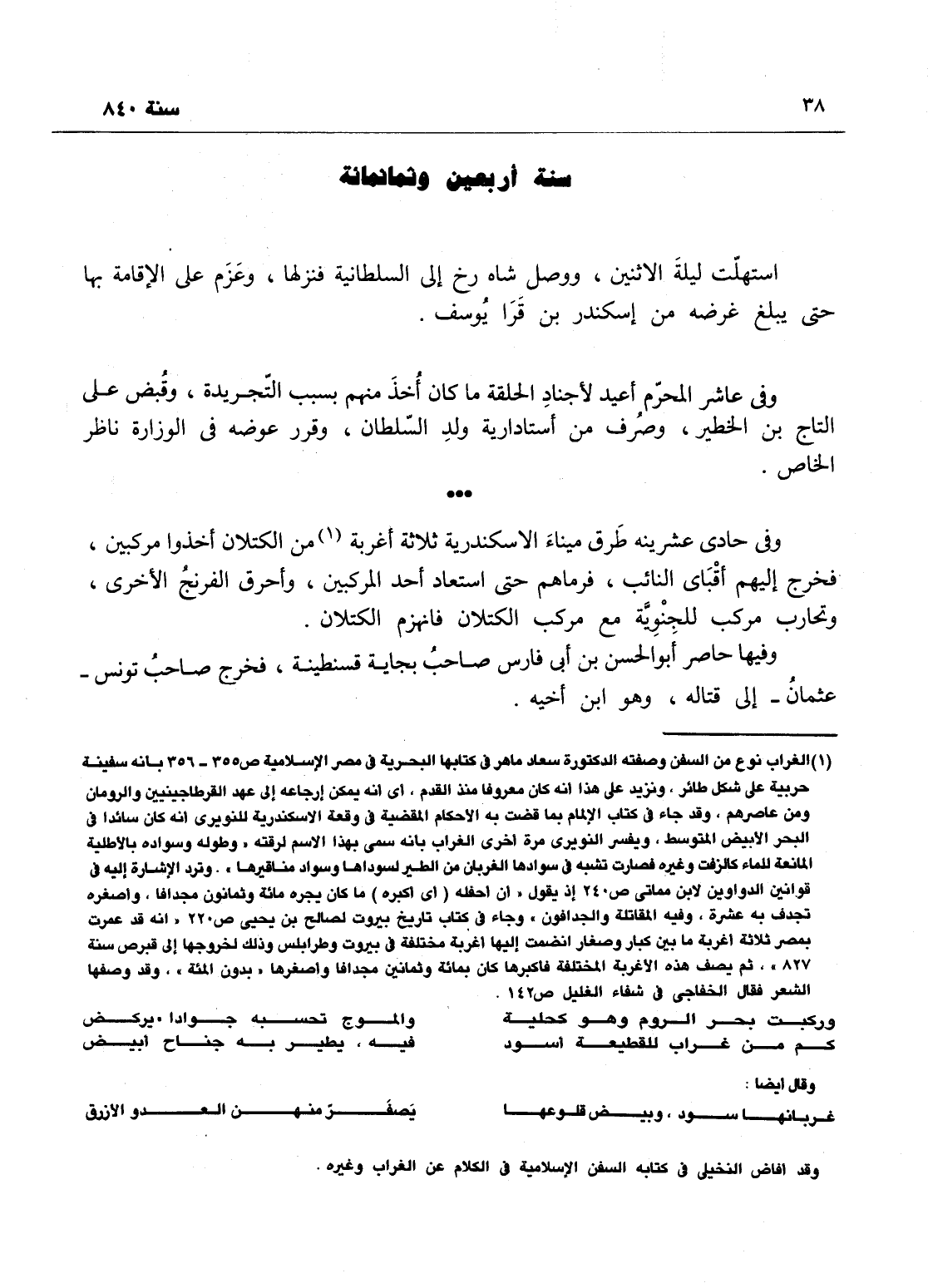 وفي حادي عشرية طرق مينا الإسكندرية ثلاثة أغربة من الكتيلان وأخذوا مركبين، فخرج إليهم آقباي النائب فراماهم حتى استعاد أحد المركبين، وأحرق الفرنج الأخرى، وتحارب مركب للجنوية مع مركب الكتيلان فانهزم الكتيلان.