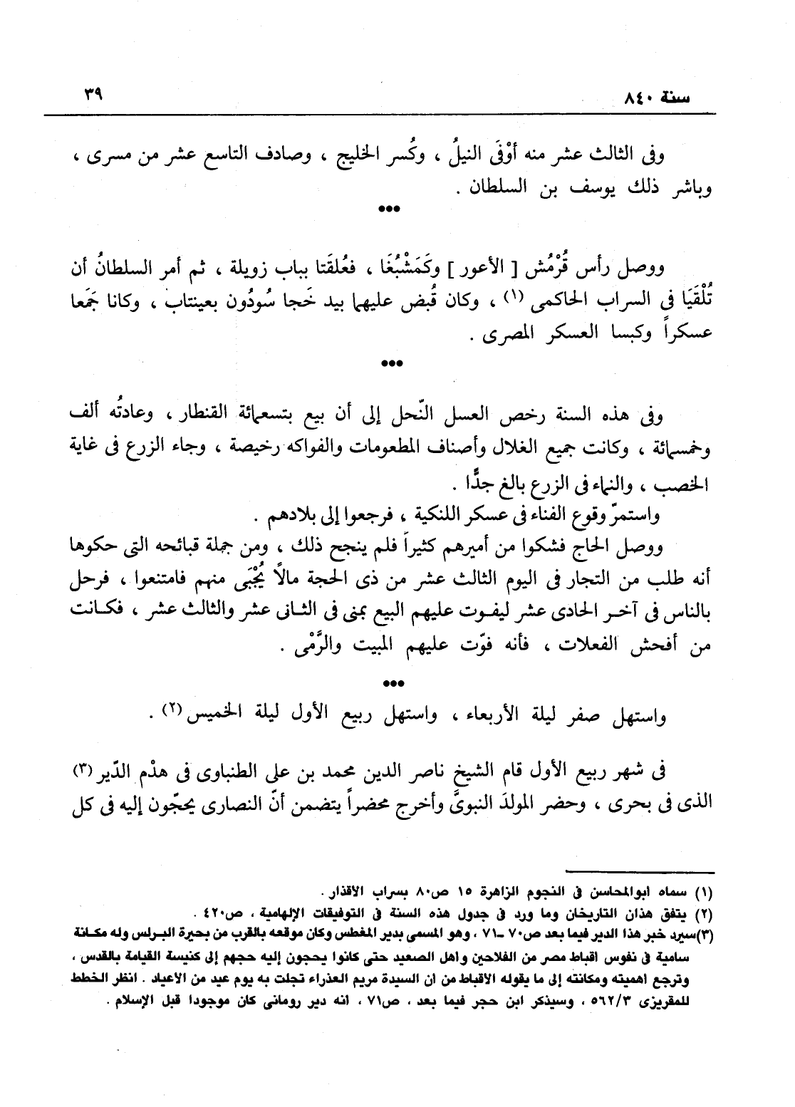 واستهل صفر ليلة الأربعاء، واستهل ربيع الأول ليلة الخميس، وفي شهر ربيع الأول قام الشيخ ناصر الدين محمد بن علي الطبناوي في هدم الدير الذي في بحرى، وحضر المولد النبوي، وأخرج محضراً يتضمن أن النصارى يحجون إليه في كل
