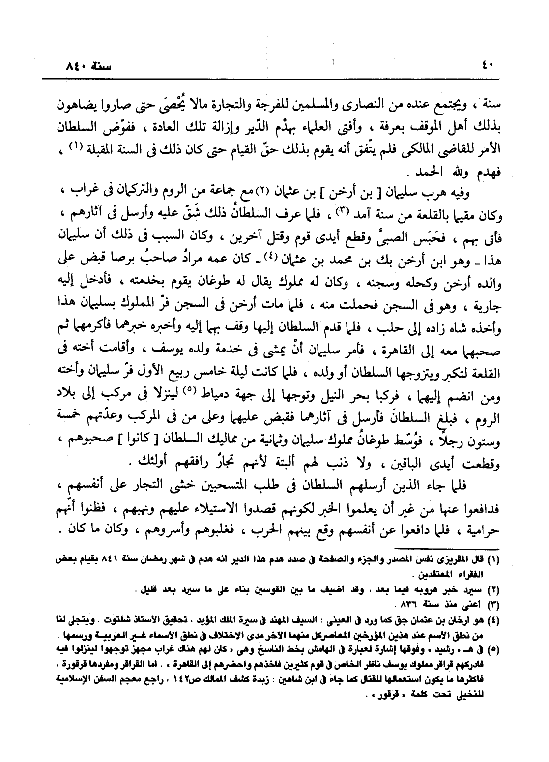 وفيه هرب سليمان بن عثمان مع جماعة من الروم والتركمان في غراب وكان مقيماً بالقلعة من سنة آمد، فلما عرف السلطان ذلك شق عليه فأرسل في آثارهم فأتى بهم، فحبس الصبي وقطع أيدي قوم وقتل آخرين، وكان السبب في ذلك أن سليمان هذا وهو ابن أرخن بك بن محمد بن عثمان كان عمه مراد صاحب برصا قبض على والده أرخن بك وكحله وسجنه، وكان له مملوك يقال له طوغان يقوم بخدمته، فأدخل إليه جارية وهو في السجن فحملت منه، فلما مات أرخن في السجن فر المملوك طوغان هذا بسليمان وأخته شاه زاده إلى حلب، فلما قدم السلطان إليها وقف بهما إليه وأخبره خبرهما، فأكرمهما ثم صحبهما معه إلى القاهرة، فأمر بسليمان أن يمشي في خدمة ولده يوسف، وأقامت أخته في القلعة لتكبر ويتزوجها السلطان أو ولده، فلما كانت ليلة خامس ربيع الأول فر سليمان وأخته ومن انضم إليهما فركبا بحر النيل وتوجها إلى جهة رشيد لينزلا في مركب إلى بلاد الروم، فبلغ السلطان فأرسل في آثارهم فقبض عليهم وعلى من في المركب وعدتهم خمسة وستون رجلاً، فوسط طوغان مملوك سليمان وثمانية من مماليك السلطان صحبوهم وقد قطعت أيدي الباقين ولا ذنب لهم البتة لأنهم تجار رافقهم أولئك، فلما جاء الذين أرسلهم السلطان في طلب المتسحبين خشى التجار على أنفسهم فدافعوا عنها من غير أن يعلموا الخبر لكونهم قصدوا الإستيلاء عليهم ونهبهم فظنوا أنهم حرامية، فلما دافعوا عن أنفسهم وقع الحرب بينهم فغلبوهم وأسروهم وكان ما كان.