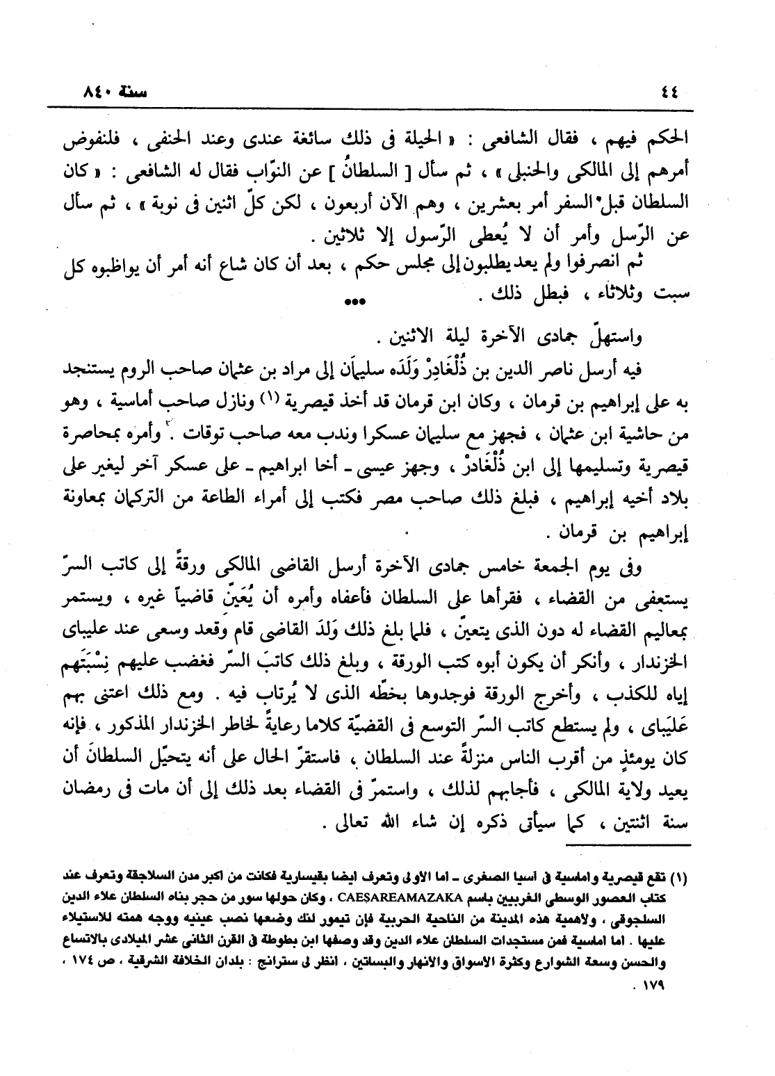 واستهل جمادى الآخرة ليلة الاثنين، فيه أرسل ناصر الدين بن دلغادر ولده سليمان إلى مراد بن عثمان صاحب الروم يستنجد به على إبراهيم بن قرمان، وكان ابن قرمان قد أخذ منه - قيصرية ونازل صاحب أماسية وهو من حاشية ابن عثمان، فجهز مع سليمان عسكراً وندب معه صاحب توقات وأمره بمحصارة قيصرية ويسلمها لابن دلغادر، وجهز عيسى أخا إبراهيم على عسكر آخر ليغير على بلاد أخيه إبراهيم، فبلغ ذلك صاحب مصر فكتب إلى أمراء الطاعة من التركمان بمعاونة إبراهيم بن قرمان.