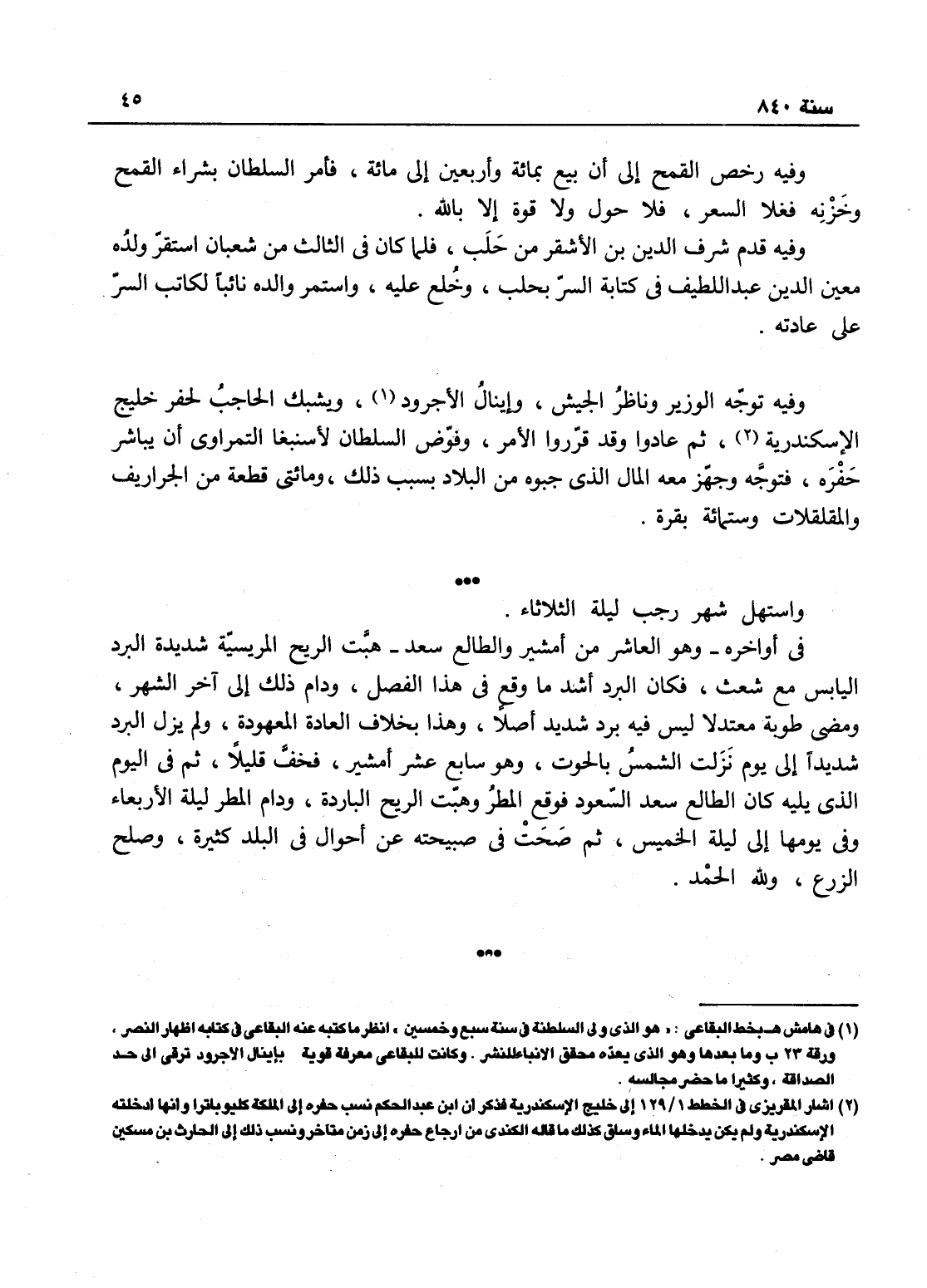 وفيه قدم شرف الدين ابن الأشقر من حلب، فلما كان في الثالث من شعبان استقر ولده تقي الدين عبد اللطيف - في كتابة السر بحلب وخلع عليه، واستمر والده نائباً لكاتب السر على عادته. وفيه توجه الوزير وناظر الجيش وأينال الأجرود ويشبك الحاجب لحفر خليج الإسكندرية ثم عادوا وقد قرروا الأمر، وفوض السلطان لآقبغا التمرازي أن يباشر حفره فتوجه، وجهز معه المال الذي جبوه من البلاد بسبب ذلك ومائتي قطعة من الجراريف والمقلقات وستمائة رأس بقر.