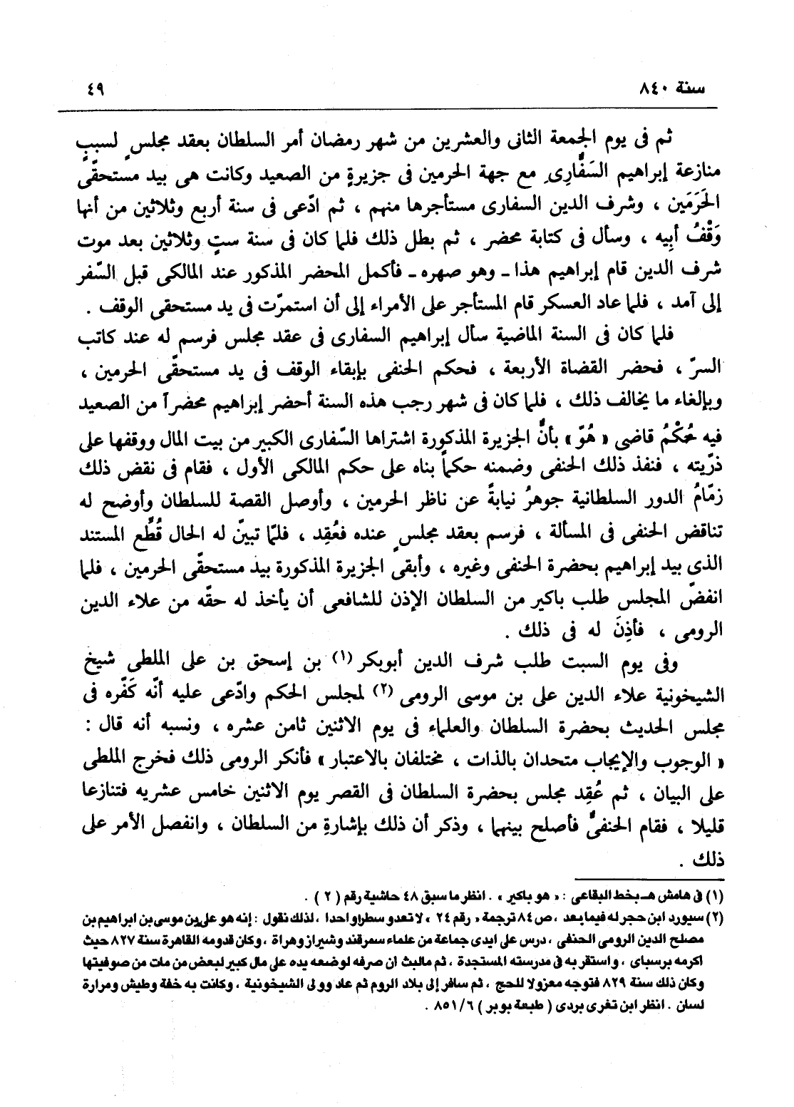ثم في يوم الجمعة الثاني والعشرين من شهر رمضان أمر السلطان بعقد مجلس بسبب منازعة إبراهيم السفارى مع جهة الحرمين في جزيرة قاو من الصعيد وكانت بيد مستحقي الحرمين وشرف الدين السفارى مستأجرها منهم، ثم ادعى في سنة أربع وثمانين أنها وقف أبيه وسأل في كتابة محضر فسطر ثم بطل، فلما كان في سنة ست وثلاثين بعد موت شرف الدين قام إبراهيم هذا وهو صهره فأكمل المحضر المذكور عند المالكي قبل السفر إلى آمد وثبت، فلما عاد العسكر قام المستأجر على الأمراء إلى أن استمرت في يد مستحقي الوقف فلما كان في السنة الماضية سأل إبراهيم السفاري عقد مجلس فرسم له عند كاتب السر فحضر القضاة الأربعة، فحكم الحنفي بإبقاء الوقف في يد مستحقي الحرمين وبإلغاء ما يخالف ذلك، فلما كان في شهر رجب هذه السنة أحضر إبراهيم محضراً من الصعيد فيه حكم قاضي هو بأن الجزيرة المذكورة اشتراها السفارى الكبير من بيت المال ووقفها على ذريته، فنفذ ذلك الحنفي وضمنه حكما بناه على حكم المالكي الأول، فقام في نقض ذلك زمام الدور السلطانية جوهر نيابة عن ناظر الحرمين، وأوصل القصة بالسلطان، وأوضح له تناقض الحنفي في المسألة، فرسم بعقد مجلس عنده فعقد، فلما تبين له الحال قطع المستند الذي بيد إبراهيم بحضرة الحنفي وغيره وأبقى الجزيرة المذكورة بيد مستحقي الحرمين، فلما انقضى المجلس طلب باكير من السلطان الإذن للشافعي أن يأخذ له حقه من علاء الدين الرومي، فأذن له.