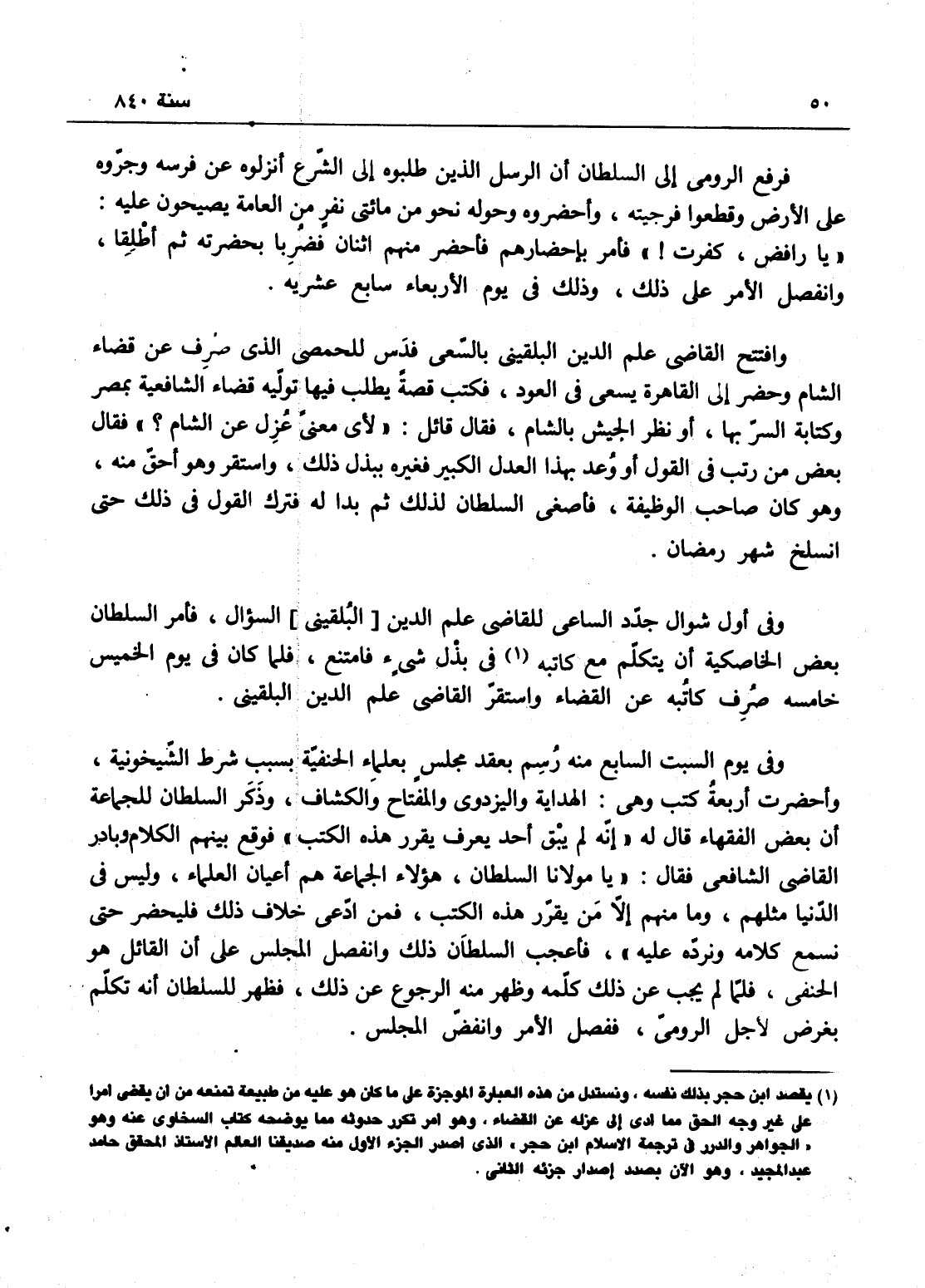 وفي أول شوال جدد الساعي للقاضي علم الدين السؤال، فأمر السلطان بعض الخاصكية أن يتكلم مع كاتبه في بذل شيء، فامتنع، فلما كان في يوم الخميس خامسه صرف كاتبه عن القضاء واستقر القاضي علم الدين البلقيني، وفي يوم السبت السابع منه رسم بعقد مجلس بعلماء الحنفية بسبب شرط الشيخونية، فأحضرت أربعة كتب وهي الهداية والبزدوي والمفتاح والكشاف، وذكر السلطان للجماعة أن بعض الفقهاء قال له إنه لم يبق أحد يعرف يقرر هذه الكتب، فوقع بينهم الكلام وبدر القاضي الشافعي فقال: يا مولانا السلطان! هؤلاء الجماعة هم أعيان العلماء، وليس في الدنيا مثلهم، وما منم إلا من يعرف - يقرر هذه الكتب، فمن ادعى خلاف ذلك فليحضر حتى نسمع كلامه ونرده عليه، فأعجب السلطان ذلك، وانفصل المجلس على أن القائل هو الحنفي، فلما لم يجب عن ذلك كلمة وظهر منه الرجوع عن ذلك ظهر للسلطان أنه تكلم يعرض لأجل الرومي، ففصل الأمر وانقضى المجلس.