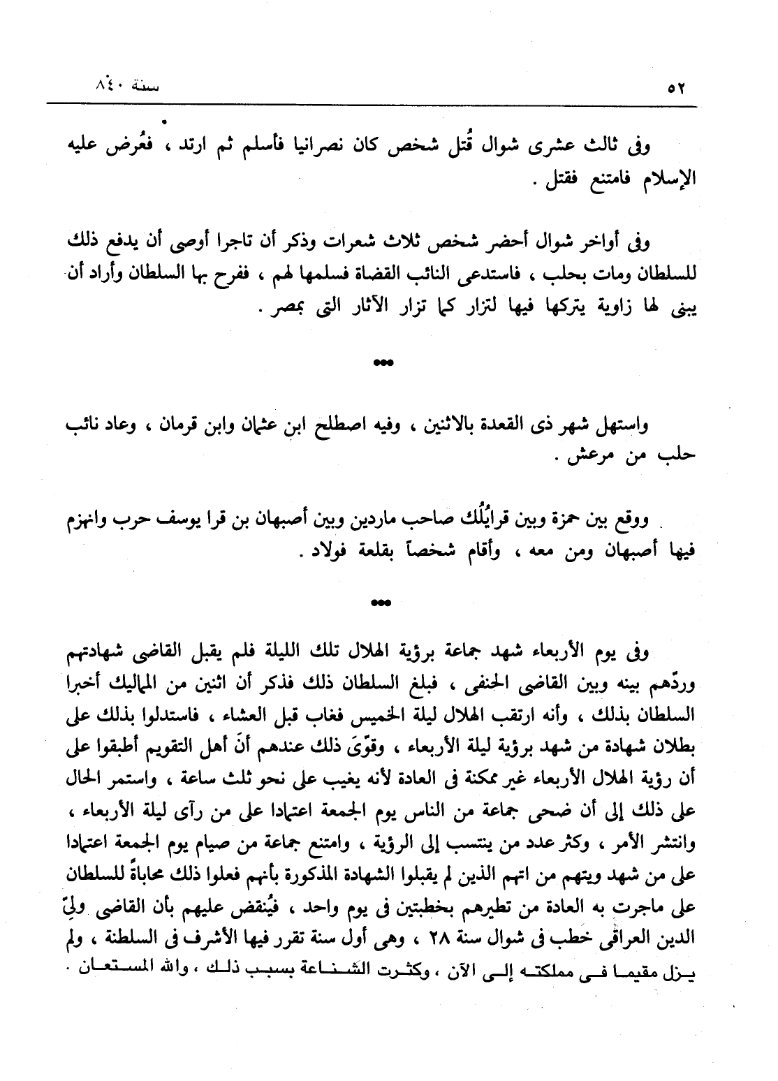 وفي يوم الأربعاء شهد جماعة برؤية الهلال تلك الليلة، فلم يقبل القاضي شهادتهم ورددهم وبين القاضي الحنفي، فبلغ السلطان ذلك فذكر إن اثنين من المماليك أخبرا السلطان بذلك وأنه ارتقب الهلال ليلة الخميس فغاب قبل العشاء، فاستدلوا بذلك - على بطلان شهادة من شهد برؤيته ليلة الأربعاء، وقوي عندهم ذلك أن أهل التقويم أطبقوا على أن رؤيته يوم الأربعاء غير ممكنة في العادة لأنه تغيب على نحو ثلث ساعة، واستمر الحال على ذلك إلى أن ضحي جماعة من الناس يوم الجمعة اعتماداً على من رأى ليلة الأربعاء، وانتشر الأمر وكثر عدد من ينسب إلى الرؤية، وامتنع جماعة من صيام يوم الجمعة اعتماداً على من شهد ويتهم من اتهم الذين لم يقبلوا الشهادة المذكور بأنهم فعلوا ذلك محاباة للسلطان لما جرت العادة من نظيرهم بخطبتين في يوم، فنقض عليهم بأن القاضي ولي الدين العراقي خطب في شوال سنة وهي ول سنة تقرر فيها الأشرف في السلطنة ثم لم يزل مستقيماً في مملكته إلى الآن، وكثرت الشناعة بسبب ذلك - والله المستعان،