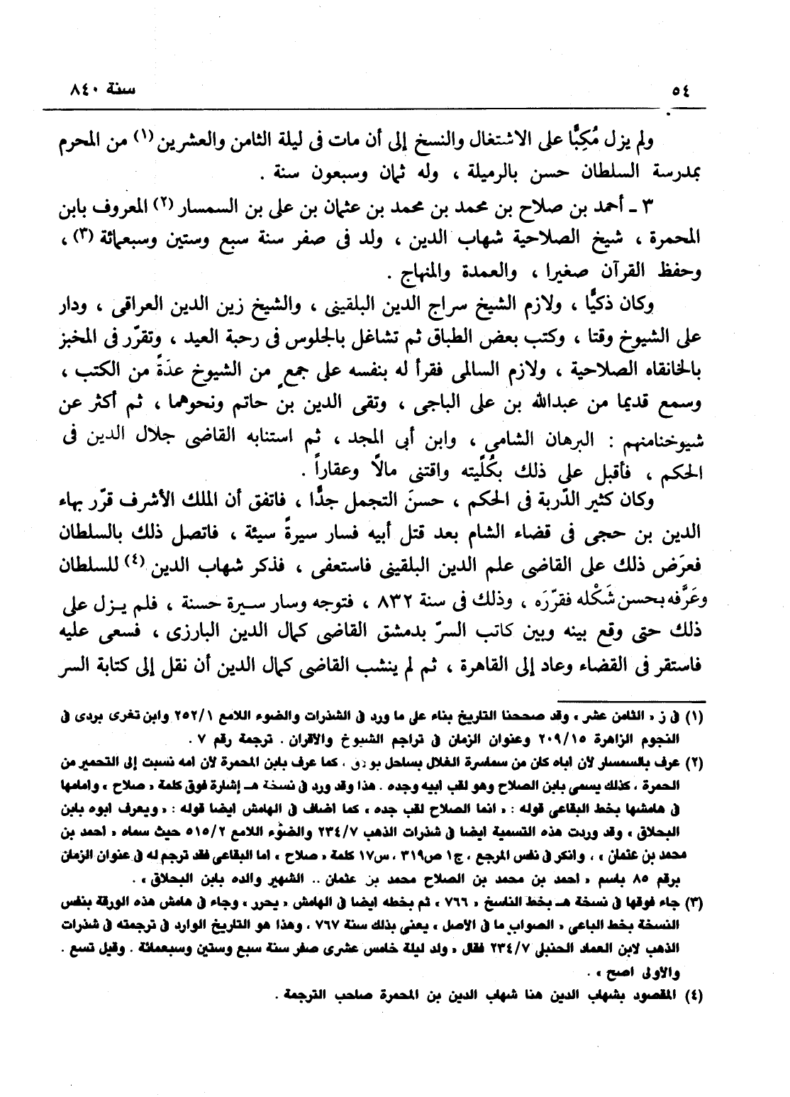 أحمد بن صلاح بن محمد بن محمد بن عثمان بن علي بن السمسار المعروف بابن المحمرة شيخ الصلاحية شهاب الدين، ولد في صفر سنة 767، وحفظ القرآن صغيراً والعمدة والمنهاج وكان ذكياً، ولازم الشيخ سراج الدين البلقيني والشيخ زين الدين العراقي، ودار على الشيوخ وقتاً، وكتب بعض الطباق، ثم تشاغل بالجلوس في رحبة العيد وتقرر في المخبز بالخانقاه الصلاحية ولازم السالمي فقرأ له بنفسه على جمع من الشيوخ عدة من الكتب، وسمع قديماً من عبد الله بن علي الباجي وتقي الدين ابن حاتم ونحوهما، ثم أكثر عن شيوخنا البرهان الشامي وابن أبي المجد، ثم استنابه القاضي جلال الدين في الحكم، فأقبل على ذلك بكليته واقتنى مالاً وعقاراً، وكان كثير الدربة في الحكم حسن التجمل جداً، فاتفق أن الملك الأشرف قرر بهاء الدين بن حجي في قضاء الشام بعد قتل أبيه فسار سيرة سيئة، فاتصل ذلك بالسلطان فعرض ذلك على القاضي علم الدين البلقيني فاستعفى، فذكر شهاب الدين للسلطان فعرفه بحسن شكله فقرره وذلك في سنة 32، فتوجه وسار سيرة حسنة، فلم يزل على ذلك حتى وقع بينه وبين كاتب السر القاضي كمال الدين بدمشق البارزي فسعى عليه فاستقر في القضاء وعاد إلى القاهرة. ثم لم ينشب القاضي كمال الدين أن نقل إلى كتابة السر