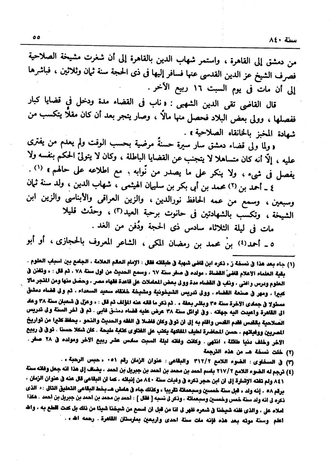 من دمشق إلى القاهرة، واستمر شهاب الدين بالقاهرة إلى أن شغرت مشيخة الصلاحية فصرف الشيخ عز الدين القدسي عنها، فسار إليها في ذي الحجة سنة 38 فباشرها إلى أن مات في يوم السبت - 4 شهر ربيع الآخر، قال القاضي تقي الدين الشهبي ناب في القضاء مدة ودخل في قضايا كبار وفصلها، وولي بعض البلاد فحصل منها مالاً، وصار يتجر بعد أن كان مقلاً يتكسب من شهادة المخبز بالخانقاه الصلاحية، ولما ولي قضاء دمشق سار سيرة مرضية بحسب الوقت، ولم يعدم من يفتري عليه إلا أنه كان متساهلاً بحيث - لا يبحث عن القضايا الباطلة، وكان لا يتولى الحكم بنفسه ولا يفصل شيئاً ولا ينكر على ما يصدر من نوابه مع اطلاعه على حالهم.