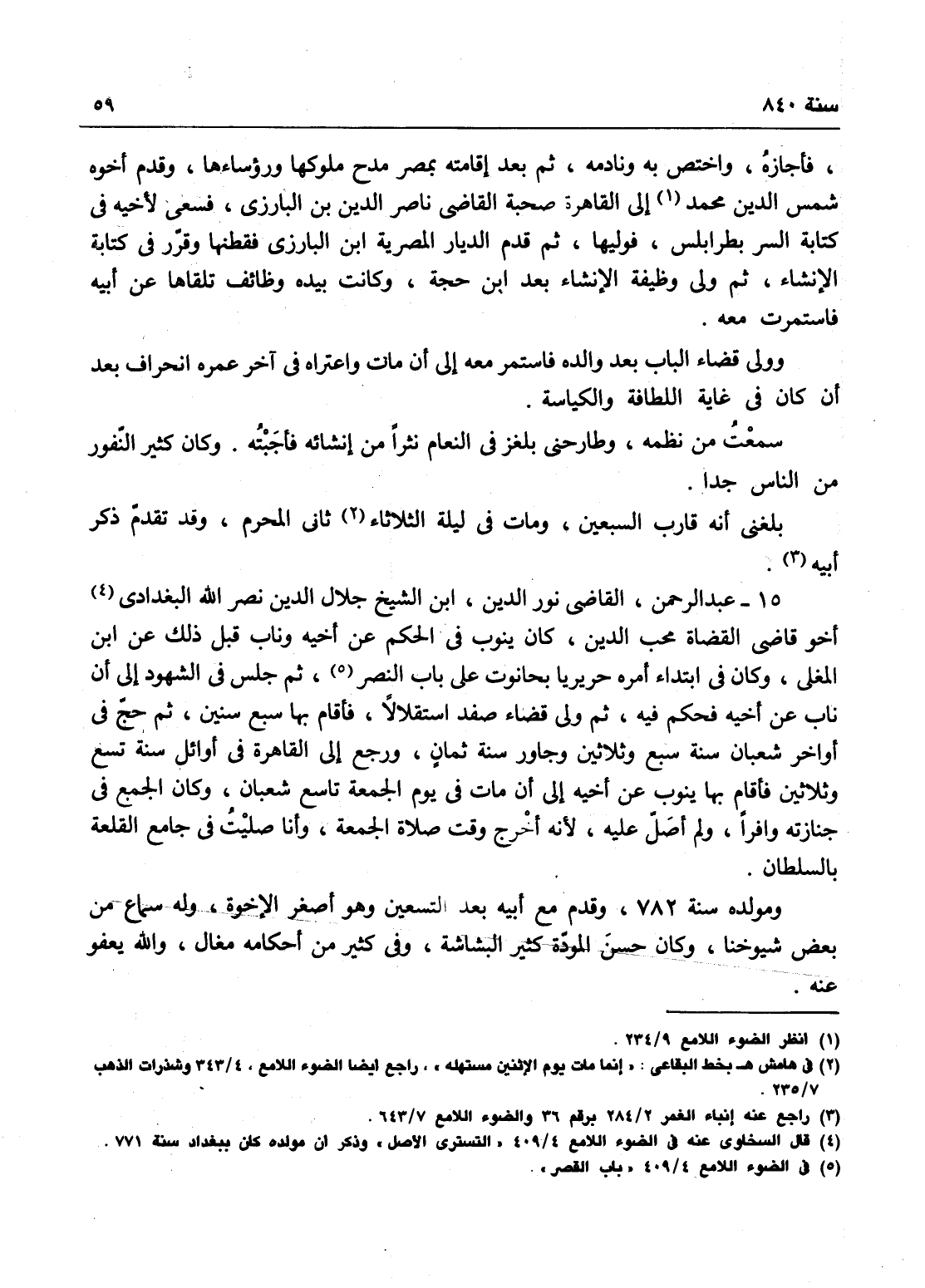 عبد الرحمن القاضي نور الدين بن الشيخ جلال الدين نصر الله، البغدادي أخو قاضي القضاة محب الدين، كان ينوب في الحكم عن اخيه، وناب قبل ذلك على ابن المغلي، وكان في ابتداء أمره حريراً بحانوت على باب القصر، ثم جلس في الشهور إلى أن ناب عن أخيه فحكم فيه، ثم ولي قضاء صفد استقلالاً فأقام بها سبع سنين، ثم حج في أواخر شعبان سنة 37 وجاور سنة ثمان، ورجع إلى القاهرة في أول سنة 39، فأقام بها ينوب عن أخيه إلى أن مات في يوم الجمعة تاسع شعبان، وكان الجمع في جنازته وافراً، ولم اصل عليه لأنه أخرج وقت صلاة الجمعة وأنا صليت في جامع القلعة بالسلطان، ومولده في سنة 783، وقدم مع أبيه بعد التسعين وهو أصغر الإخوة، وله سماع من بعض شيوخنا، وكان حسن المودة كثير البشاشة، وفي كثير من أحكامه مقال - والله يعفو عنه!