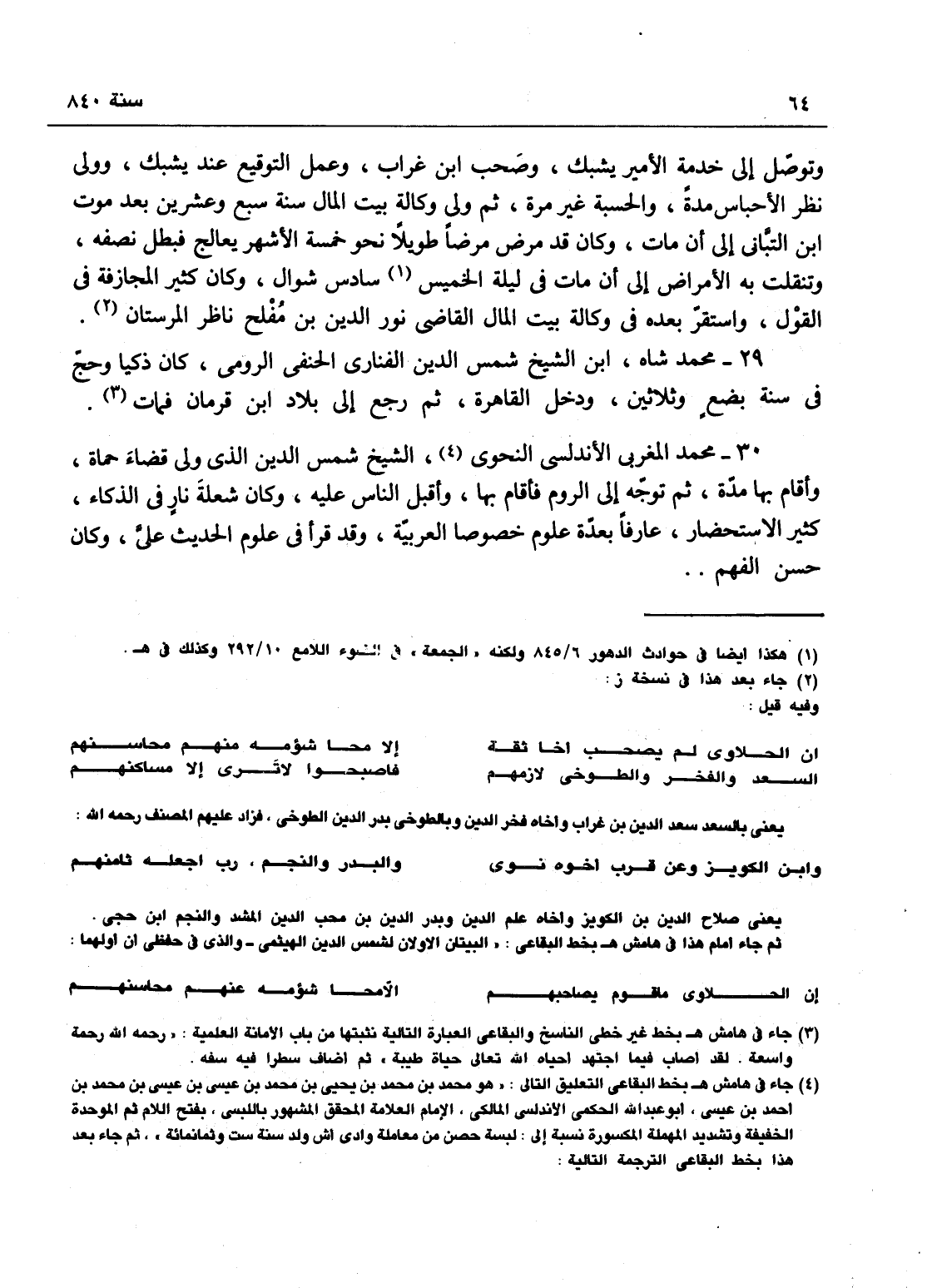 وتوصل إلى خدمة الأمير يشبك، وصحب ابن غراب، وعمل التوقيع عند يشبك، وولي نظر الأحباس مدة والحسبة غير مرة، ثم ولي وكالة بيت المال سنة سبع وعشرين بعد موت ابن التباني إلى أن مات، وكان قد مرض مرضاً طويلاً نحو الخمسة أشهر، أصابه فالج فبطل نصفه، وتنقلت به الأمراض إلى أن مات في ليلة الجمعة سادس شوال، وكان كثير المجازفة في النقل، واستقر بعده في وكالة بيت المال القاضي نور الدين مفلح ناظر المارستان وفيه قيل: