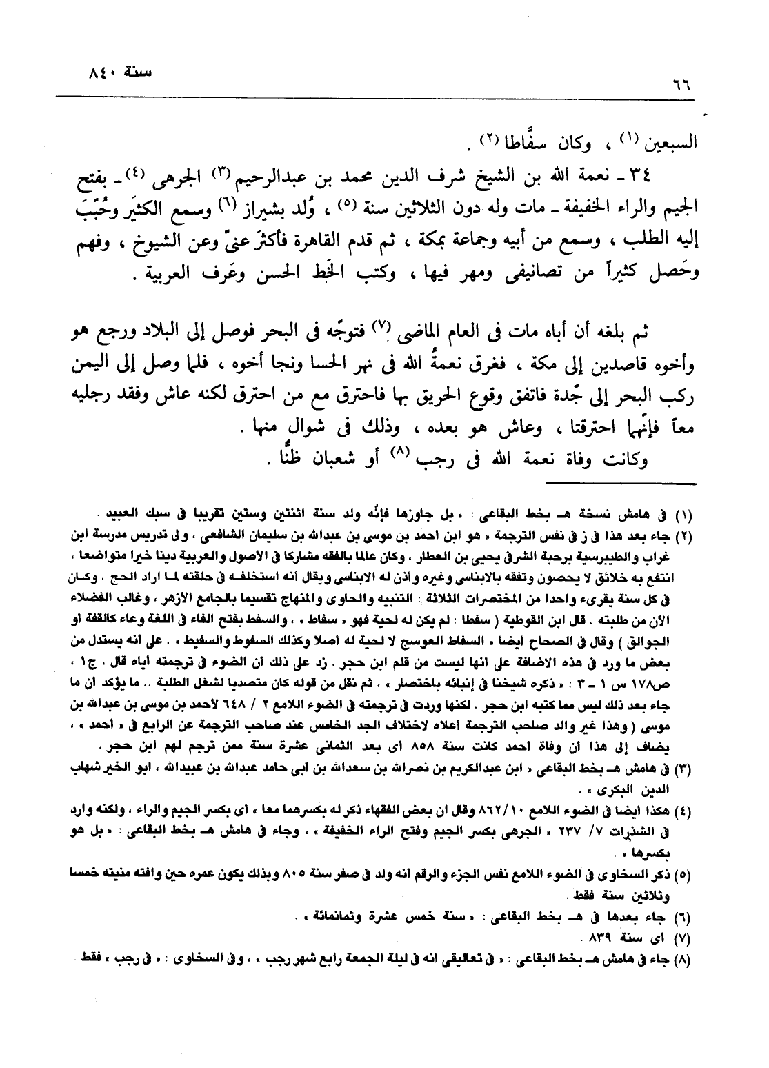 نعمة الله بن الشيخ شرف الدين محمد بن عبد الرحيم، الجرهي - بفتح الجيم والراء الخفيفة، مات وله دون الثلاثين سنة، ولد بشيراز وسمع الكثير وحبب إليه الطلب وسمع من أبيه وجماعة بمكة، ثم قدم القاهرة فأكثر عني وعن الشيوخ وفهم وحصل كثيراً من تصانيفي ومهر فيها، وكتب الخط الحسن وعرف العربية، ثم بلغه أن أباه مات في العام الماضي فتوجه في البحر فوصل إلى البلاد ورجع هو وأخوه قاصدين إلى مكة فغرق نعمة الله في نهر الحسا ونجا أخوه، فلما وصل إلى اليمن ركب البحر إلى جدة، فاتفق وقوع الحريق بها فاحترق مع من احترق لكنه عاش وفقد رجليه معاً فإنهما احترقا، وعاش هو لعمره وذلك في شوال منها، وكانت وفاة نعمة الله في رجب أو شعبان ظناً.