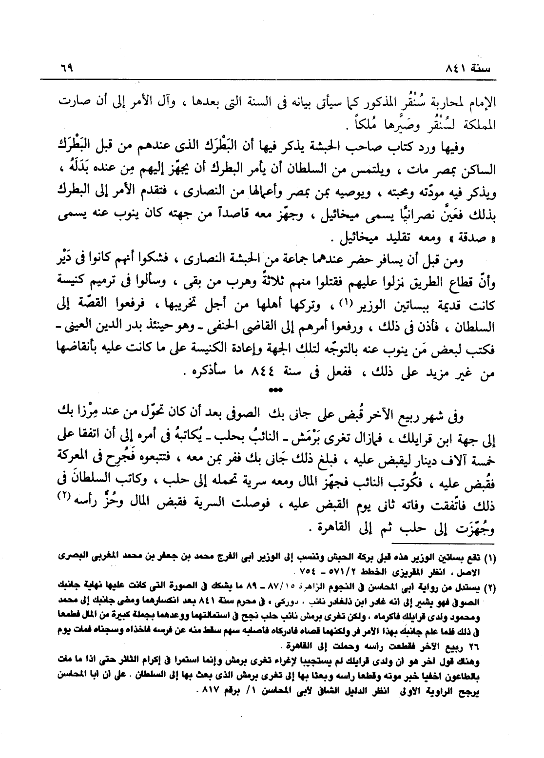 وفيها ورد كتب صاحب الحبشة يذكر فيه أن البطرك الذي عندهم من قبل البطرك الساكن بمصر مات ويلتمس من السلطان أن يأمر البطرك أن يجهز إليهم من عنده بدله ويذكر فيه مودة ومحبة وتوصية بمن بمصر وأعمالها من النصارى، فتقدم الأمر إلى البطرك بذلك فبعث نصرانياً يسمى مخاييل، ومن قبل أن يسافرا حضر عندهما جماعة من الحبشى نصارى فشكوا أنهم كانوا في دير وأن قطاع الطريق نزلوا عليهم فقتلوا منهم ثلاثة وهرب من بقي، وسألوا في ترميم كنيسة كانت قديمة ببساتين الوزير وتركها أهلها من أجل تخريبها، فرفعوا قصة إلى السلطان فأذن في ذلك، ورفعوا أمرهم إلى القاضي الحنفي وهو حينئذ بدر الدين العيني فكتب لبعض من ينوب عنه بالتوجه لتلك الجهة وإعادة الكنيسة على ما كانت عليه بأنقاضها من غير مزيد على ذلك ففعل، فكان في سنة 844 ما سأذكره.