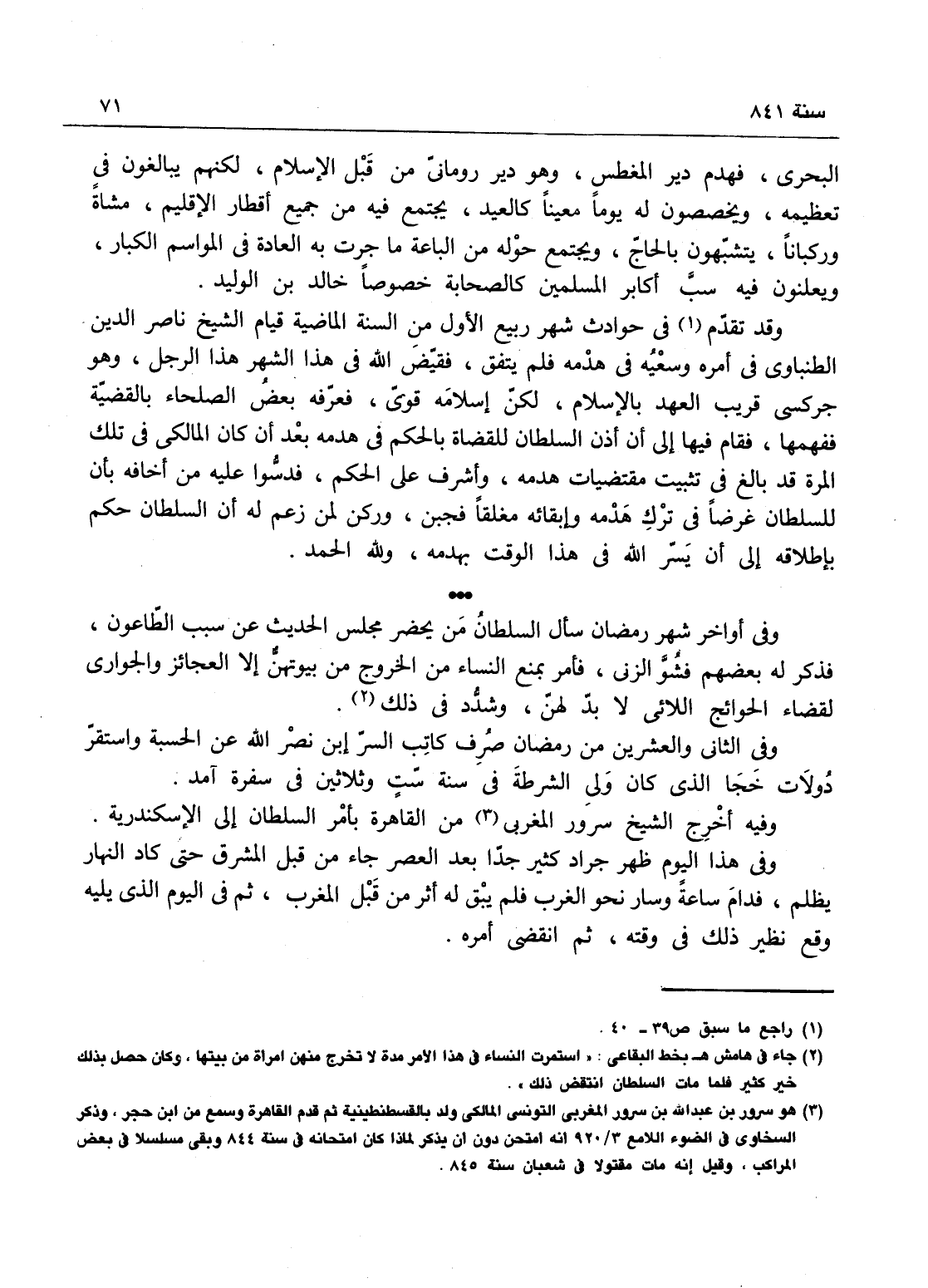 البحري فهدم دير المغطس وهو دير روماني من قبل الإسلام لكنهم يبالغون في تعظيمه ويخصون له يوماً معيناً كالعيد، يجتمع فيه من جميع أقطار الإقليم مشاة وركباناً، ويتشبهون بالحجاج، ويجتمع حوله من الباعة ما جرت به العادة في المواسم الكبار، ويعلنون فيه بسب أكابر المسلمين كالصحابة خصوصاً خالد بن الوليد، وقد تقدم في حوادث شهر ربيع الأول من السنة الماضية قيام الشيخ ناصر الدين الطنباوي في أمره وسعيه في هدمه فلم يتفق، فقيض الله في هذا الشهر هذا الرجل وهو جركسي قريب العهد بالإسلام لكن إسلامه قوي، فعرفه بعض الصلحاء بالقضية ففهمها، فقام فيها إلى أن أذن السلطان للقضاة بالحكم بهدمه بعد إن كان المالكي في تلك المرة - قد بالغ في تثبيت مقتضيات هدمه وأشرف على الحكم، فدسوا عليه من أخافه بأن للسلطان غرضاً في ترك هدمه وإبقائه مغلقاً، فجبن وركن لمن زعم له أن السلطان حكم بإغلاقه إلى إن يسر الله في هذا الوقت هدمه - ولله الحمد.