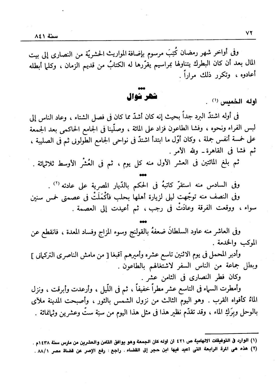 شوال، أوله الخميس، في أوله اشتد البرد جداً بحيث أنه كان أشد مما كان في فصل الشتاء وعاد الناس إلى لبس الفراء ونحوها، وفشا الطاعون فزاد على المائة، وصلينا في الجامع الحاكمي بعد الجمعة على خمسة أنفس جملة، وكان أول ما بدا اشتد - في نواحي الجامع الطولوني ثم في الصليبة ثم فشا في القاهرة - ولله الأمر.