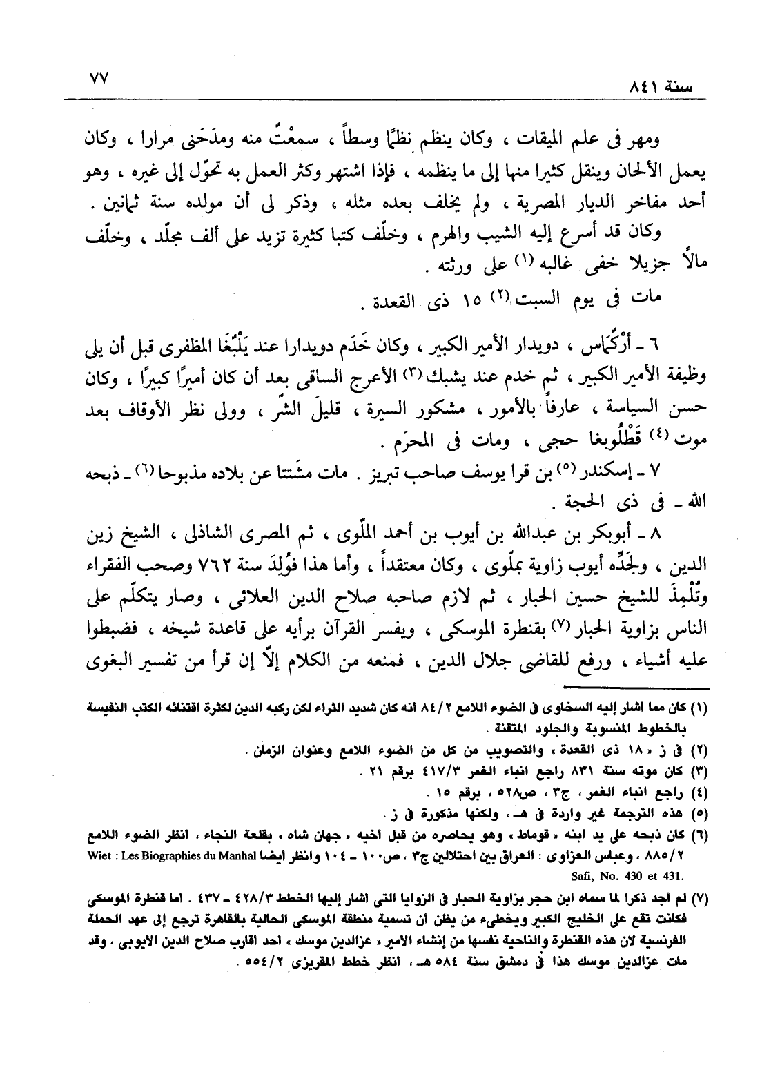 ومهر في علم الميقات، وكان ينظم نظماً وسطاً، سمعت منه ومدحني مراراً. وكان يعمل الألحان وينقل كثيراً منها إلى ما ينظمه، فإذا اشتهر وكثر العمل به تحول إلى غيره، وهو أحد مفاخر الديار المصرية ولم يخلف بعده مثله، ذكر لي أن مولده سنة ثمانين، وكان قد أسرع إليه الشيب والهرم، وخلف كتباً كثيرة تزيد على ألف مجلد، وخلف مالاً جزيلاً خفي غالبه على ورثته.