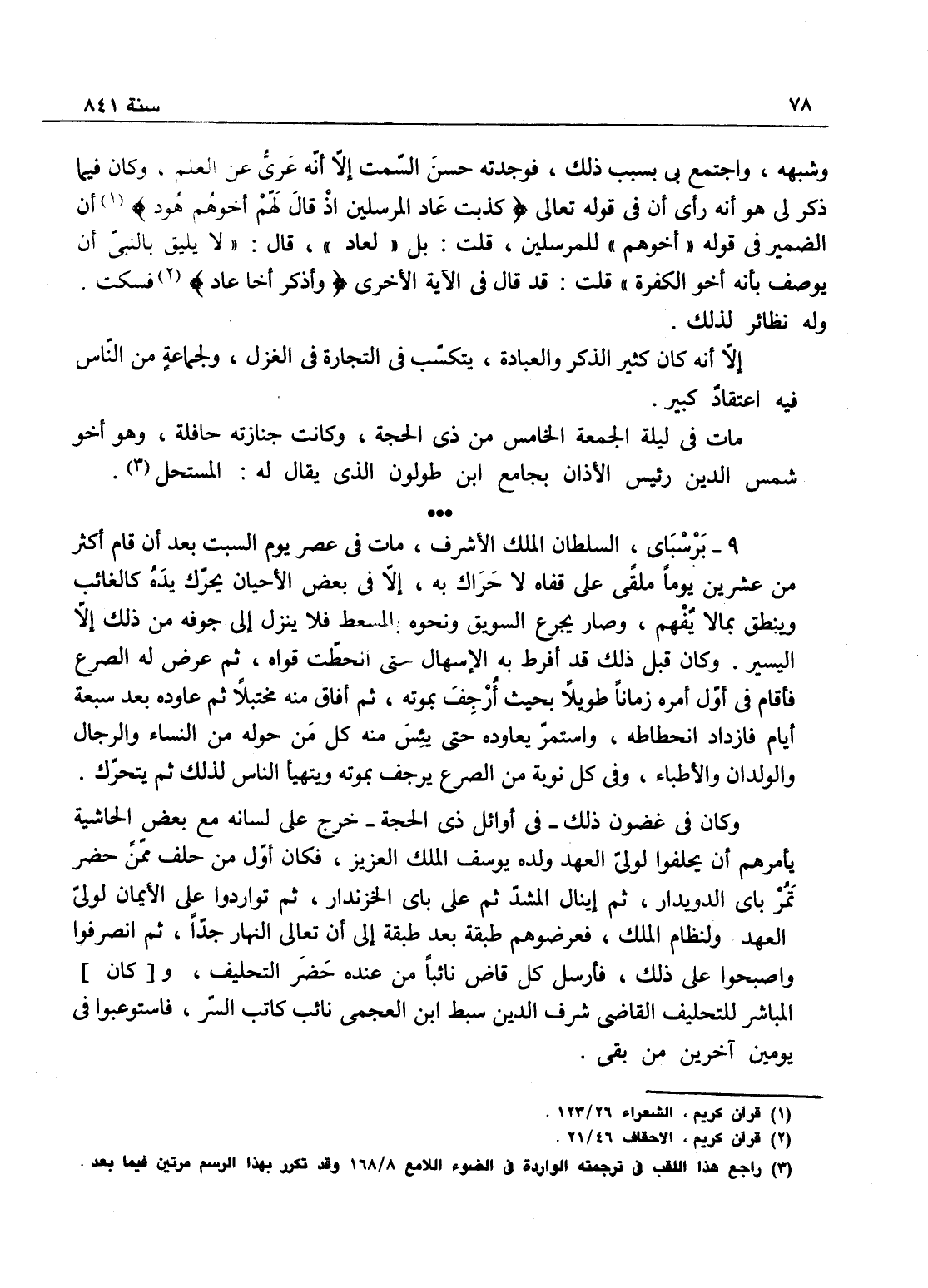 برسباي السلطان الملك الأشرف، مات في عصر يوم السبت بعد أن أقام أكثر من عشرين يوماً ملقى على قفاه لا حراك به إلا في بعض الأحيان يحرك بده كالعابث أو ينطق بما لا يفهم، وصار يجرع السويق ونحوه بالمسعط، فلا ينزل إلى جوفه من ذلك إلا اليسير، وكان قبل ذلك قد أفرط به الإسهال حتى انحطت قوته، ثم عرض له الصرع فأقام في أول مرة زماناً طويلاً بحيث أرجف بموته ثم أفاق منه مختبلاً، ثم عاوده بعد سبعة أيام فازداد انحطاطاً، واستمر يعاوده حتى يئس منه كل من حوله من النساء والرجال والأطباء، وفي كل نوبة من الصرعة يرجف بموته ويتهيا الناس لذلك ثم يتحرك، وكان في غضون ذلك في أوائل ذي الحجة خرج وجلس على لسانه مع بعض الحاشية يأمرهم أن يحلفوا لولي العهد ولده يوسف الملك العزيز، قكان أول من حلف ممن حضر تمربائي الدويدار ثم إينال المشد ثم على باي الخازندار، ثم تواردوا على الإيمان لولي العهد ولنظام الملك فعرضوهم طبقة بعد طبقة إلى أن تعالى النهار جداً، ثم انصرفوا واصبحوا على ذلك فأرسل كل قاض نائباً من عنده حضر التحليف، والمباشر للتحليف القاضي شرف الدين سبط ابن العجمي نائب كاتب السر، فاستوعبوا في يومين آخرين من بقي،
