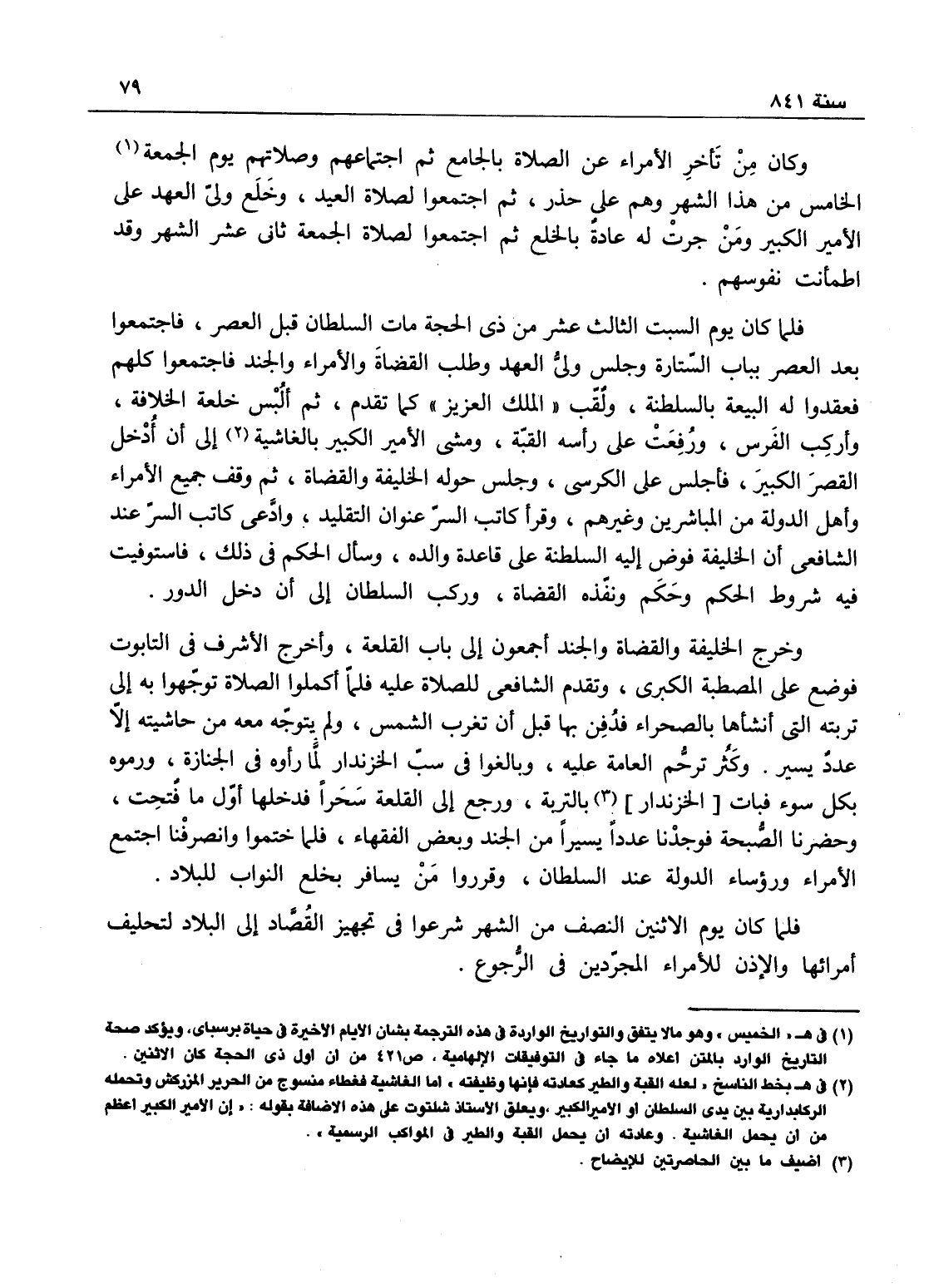 وكان من تأخر الأمراء عن الصلاة بالجامع ثم اجتماعهم وصلاتهم يوم الخميس الخامس من هذا الشهر وهم على حذر، ثم اجتمعوا لصلاة العيد، وخلع ولي العهد على الأمير الكبير جرت له عادة بالخلع، ثم اجتمعوا لصلاة الجمعة ثاني عشر الشهر وقد اطمأنت نفوسهم، فلما كان يوم الست الثالث عشر من ذي الحجة مات السلطان قبل العصر، فاجتمعوا بعد العصر بباب الستارة، وجلس ولي العهد وطلب القضاة والأمراء والجند، فاجتمعوا كلهم فعقدوا له البيعة بالسلطنة، ولقب الملك العزيز كما تقدم، ثم ألبس خلعة الخلافة وأركب الفرس ورفعت على رأسه القبة، ومشى الامير الكبير بالغاشية إلى أن دخل القصر الكبير فأجلس على الكرسي وجلس حوله الخليفة والقضاة، ثم وقف جميع الامراء وأهل الدولة من المباشرين وغيرهم، وقرأ كاتب السر عنوان التقليد، وادعى كاتب السر عند الشافعي عن السلطان إن الخليفة فوض إليه السلطنة على قاعدة والده وسأل الحكم بذلك فاستوفيت فيه شروط الحكم وحكم ونفذه القضاة، وركب السلطان إلى داخل الدور، وخرج الخليفة والقضاة والأمراء - والجند أجمعين إلى باب القلعة؛ وأخرج الأشرف في التابوت فوضع على المصطبة الكبرى، وتقدم الشافعي للصلاة عليه، فلما أكملوا الصلاة توجهوا به إلى تربته التي أنشأها بالصحراء فدفن بها قبل أن تغرب الشمس، ولم يتوجه معه من حاشيته إلا عدد يسير، وكثر ترحم العامة عليه، وبالغوا في سب الخازندار لما رواه في الجنازة ورموه بكل سوء، فبات بالتربة ورجع إلى القلعة فدخلها أول ما فتحت، وحضرنا الصبحة فوجدنا عدداً يسيراً من الجند وبعض الفقهاء، فلما ختم وانصرفنا اجتمع الأمراء ورؤساء الدولة عند السلطان وقرروا أمور من يسافر بخلع النواب بالبلاد، فلما كان يوم الاثنين النصف من الشهر شرعوا في تجهيز القصاد إلى البلاد لتحليف أمرائها والإذن للأمراء المجردين في الرجوع..،