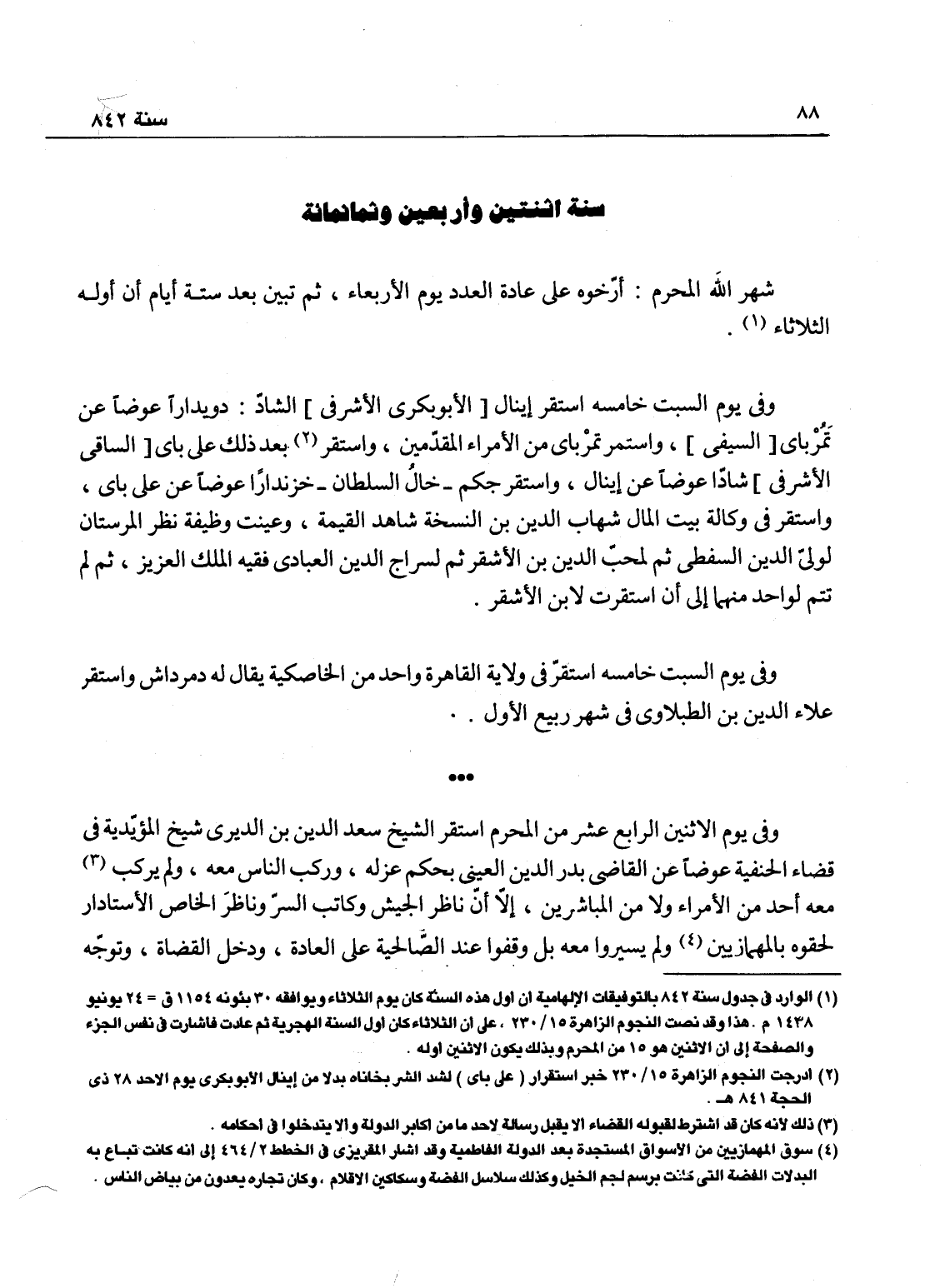 وفي يوم السبت خامسه استقر أينال الشاد دويدار عوض تمرباي، واستقر تمرباي من الأمراء المقدمين، واستقر بعد ذلك - على باي شادا عوضاً عن اينال، واستقر جكم خال السلطان خازندار عوضاً عن هلي باي، واستقر في وكالة بيت المال شهاب الدين ابن الشيخة شاهد القيمة، وعينت وظيفة نظر المارستان لولي الدين السنطي ثم لمحب الدين بن الأشقر ثم لسراج الدين العبادي فقيه الملك العزيز، ثم لم تتم لواحد منهما إلى أن، استقرت لابن الأشقر.