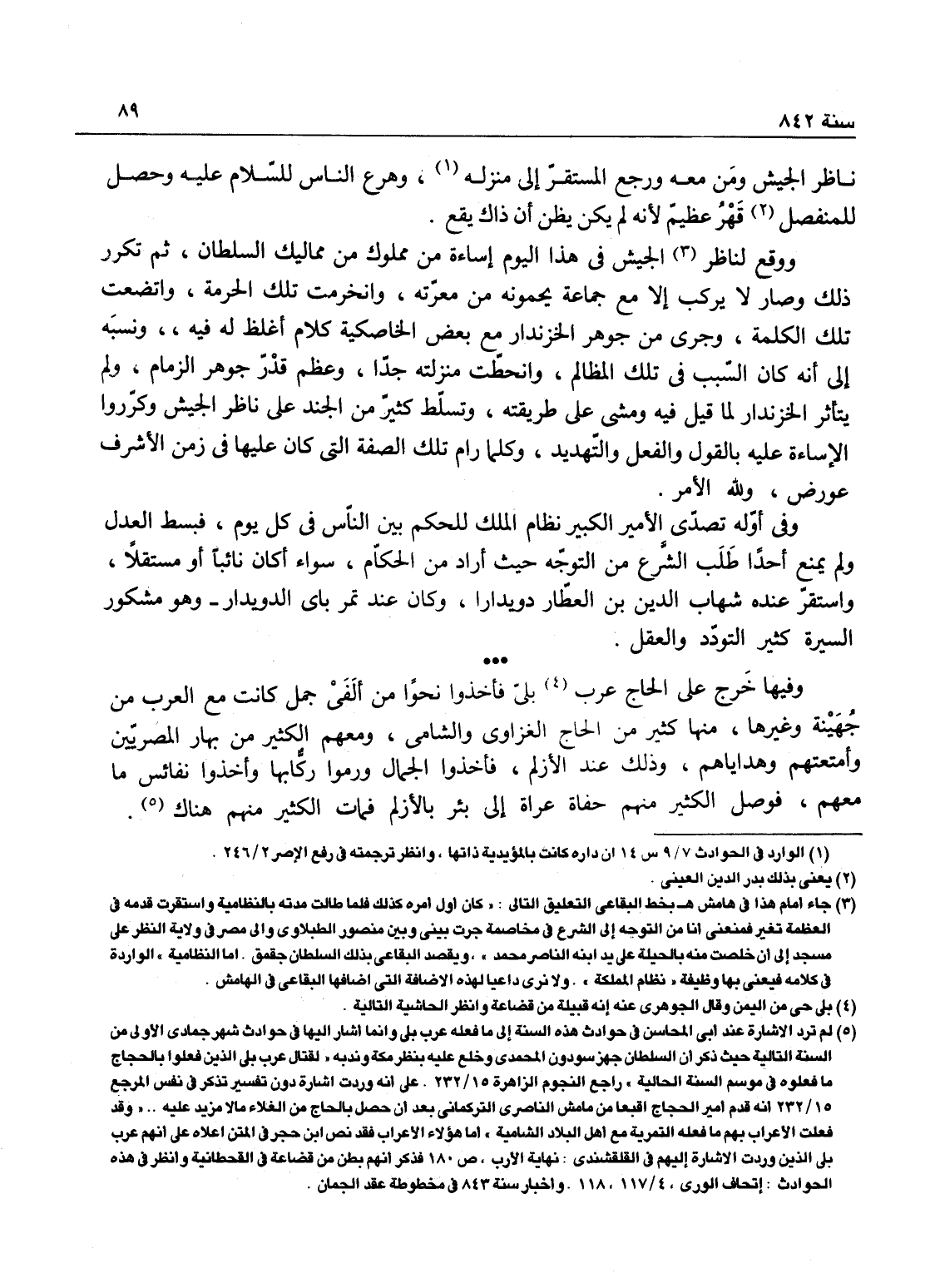 ناظر الجيش ومن معه، ورجع المستقر إلى منزله، وهرع الناس للسلام على المنفصل، وحصل للمنفصل قهر عظيم لأنه لم يكن يظن أن ذلك يقع، ووقع في هذا اليوم لناظر الجيش إساءة من مملوك من مماليك السلطان ثم تكرر ذلك، وصار لا يركب إلا مع جماعة يحمونه من معرتهم - وانخرقت تلك الحرمة واتضعت تلك الكلمة وجرى بين جوهر الخازندار مع بعض الخاصكية كلام أغلظ له فيه، ونسبه إلى انه كان السبب في تلك المظالم، وانحطت منزلته جداً وعظم قدر جوهر الزمام، ولم يتأثر الخازندار لما قيل فيه ومشى على طريقته، وتسلط كثيرمن الجند على ناظر الجيش وكرروا الإساءة عليه بالقول والفعل والتهديد، وكلما رام تلك الصفة التي كان عليها في زمن الأشرف عورض - ولله الامر.