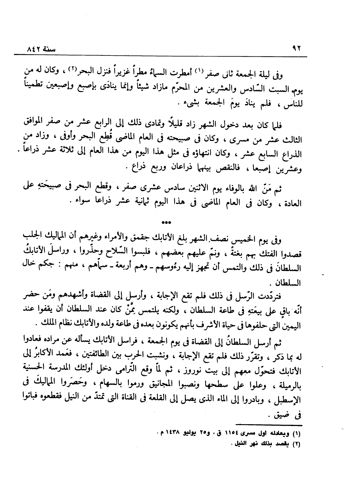 وفي ليلة الجمعة ثاني صفر أمطرت السماء مطراً غزيراً غير كثير فنزل البحر، وكان له من يوم السبت السادس والعشرين من المحرم ما زاد شيئاً إنما ينادي بإصبع أو إصبعين تطميناً للناس فلم يناد يوم الجمعة بشيء، فلما كان بعد دخول الشهر زاد قليلاً، وتمادى ذلك إلى الرابع عشر من صفر الموافق للثالث عشر من مسري، فكان في صبيحته في العام الماضي قطع البحر واوفى وزاد من الذراع السابع عشر، وكان انتهاءه في مثل هذا اليوم من هذا العام إلى ثلاثة عشر ذراعاً وعشرين إصبعاً، فالنقص بينهما ذراعان وربع ذراع، ثم من الله بوفاء النيل يوم الاثنين سادس عشري صفر، وقطع البحر في صبيحته على العادة، وكان في العام الماضي في هذا اليوم ثمانية عشر ذراعاً سواء.