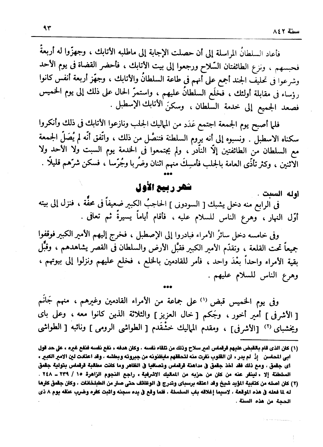 وفي يوم الخميس قبض على جماعة من الأمراء القادمين وغيرهم، منهم جانم أمير آخور، وجكم والثلاثة الذين كانوا قبضوا معه وعلى باي ويخشباي وأينال ومقدم المماليك ونائبه