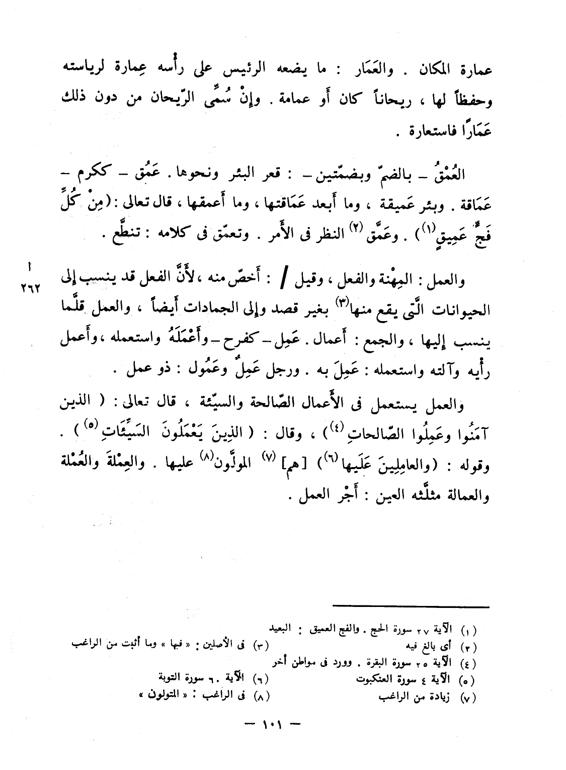والعمل يستعمل فى الأَعمال الصّالحة والسيّئة، قال تعالى: {الذين آمَنُواْ وَعَمِلُواْ الصالحات} ، وقال: {الذين يَعْمَلُونَ السيئات} . وقوله: {والعاملين عَلَيْهَا} [هم] المولَّون عليها. والعِمْلةَ والعُمْلة والعمالة مثلَّثه العين: أَجْر العمل.