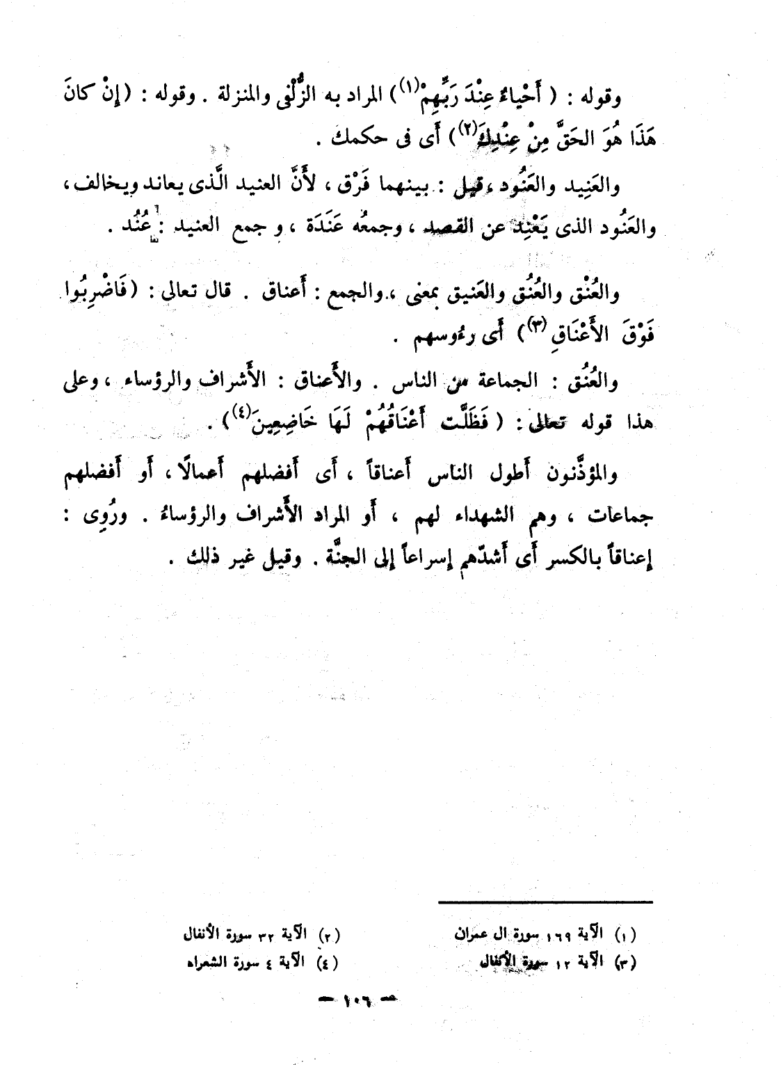والعُنْق والعُنُق والعَنيق بمعنى، والجمع: أَعناق. قال تعالى: {فاضربوا فَوْقَ الأعناق} أَى رءُوسهم.