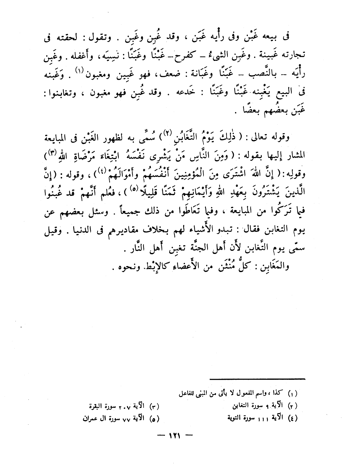 وقوله تعالى: {ذَلِكَ يَوْمُ التغابن} سُمِّى به لظهور الغَبْن فى المبايعة المشار إِليها بقوله: {وَمِنَ الناس مَن يَشْرِي نَفْسَهُ ابتغآء مَرْضَاتِ الله} وقوله: {إِنَّ الله اشترى مِنَ المؤمنين أَنفُسَهُمْ وَأَمْوَالَهُمْ} ، وقوله: {إِنَّ الَّذِينَ يَشْتَرُونَ بِعَهْدِ الله وَأَيْمَانِهِمْ ثَمَناً قَلِيلاً} ، فعُلم أَنَّهمْ قد غُبنُوا فيما تَرَكُوا من المبايعة، وفيما تَعَاطَوا من ذلك جميعاً. وسئل بعضهم عن يوم التغابن فقال: تبدو الأَشياء لهم بخلاف مقاديرهم فى الدنيا. وقيل سمّى يوم التَّغابن لأَن أَهل الجنَّة تغبِن أَهل النَّار.