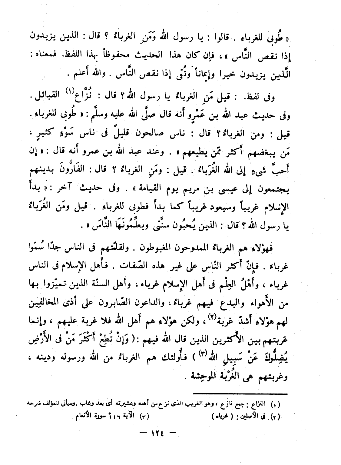 "طُوبى للغرباءِ. قيل: ومن الغرباءُ؟ قال: ناس صالحون قليلٌ فى ناس سَوْءٍ كثير، مَن يبغضهم أَكثر ممّن يطيعهم". وعند عبد الله بن عمرو أَنه قال: "إِن أَحبَّ شىءٍ إِلى الله الغُرَباءُ. قيل: ومَنِ الغرباءُ؟ قال: الفَارُّونَ بدينهم يجتمعون إِلى عيسى بن مريم يوم القيامة". وفى حديث آخر: "بدأَ الإِسلام غريباً وسيعود غريباً كما بدأَ فطوبى للغرباءِ. قيل ومَن الغُرَباءُ يا رسول الله؟ قال: الذين يُحبُون سنَّتى ويعلِّمُونَهَا النَّاسَ".