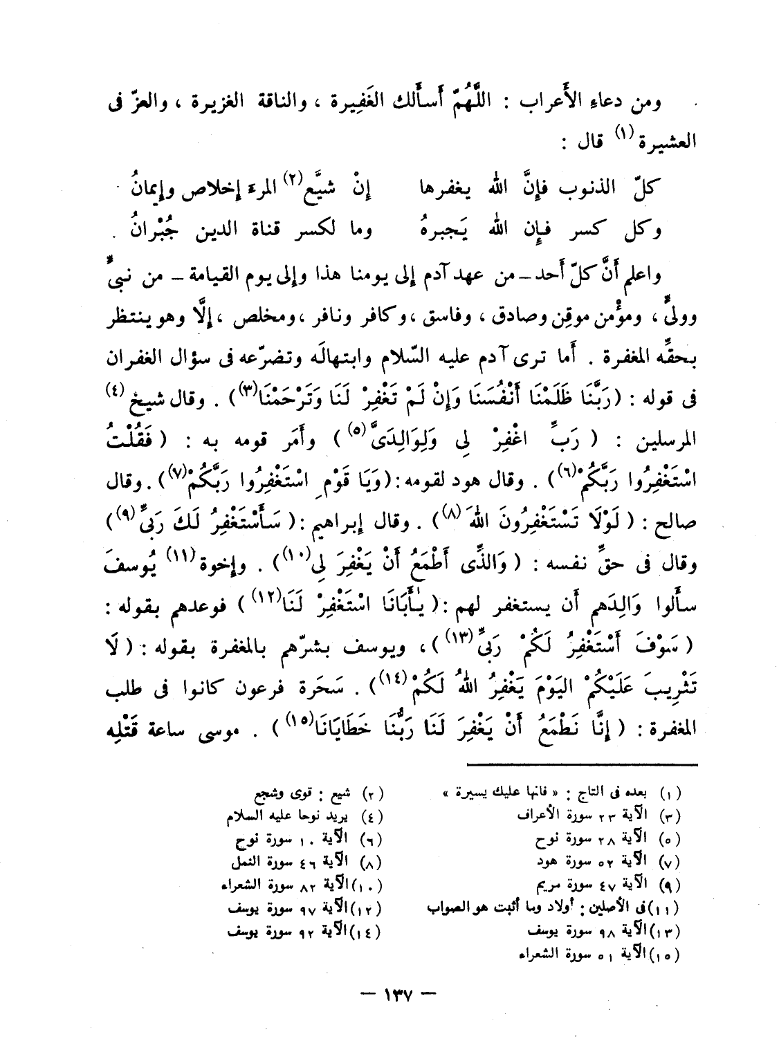 واعلم أَنَّ كلّ أَحد - من عهد آدم إِلى يومنا هذا وإِلى يوم القيامة - من نبىٍّ وولىٍّ، ومؤْمن موقِن وصادق، وفاسق، وكافر ونافر، ومخلص، إِلاَّ وهو ينتظر بحقَّه المغفرة. أَما ترى آدم عليه السّلام وابتهالَه وتضرّعه فى سؤال الغفران فى قوله: {رَبَّنَا ظَلَمْنَآ أَنفُسَنَا وَإِن لَّمْ تَغْفِرْ لَنَا وَتَرْحَمْنَا} . وقال شيخ المرسلين: {رَّبِّ اغفر لِي وَلِوَالِدَيَّ} وأَمَر قومه به: {فَقُلْتُ استغفروا رَبَّكُمْ} . وقال هود لقومه: {وياقوم استغفروا رَبَّكُمْ} . وقال صالح: {لَوْلاَ تَسْتَغْفِرُونَ الله} . وقال إِبراهيم: {سَأَسْتَغْفِرُ لَكَ ربي} وقال فى حقِّ نفسه: {والذي أَطْمَعُ أَن يَغْفِرَ لِي} . وإِخوة يُوسفَ سأَلوا وَالِدَهم أَن يستغفر لهم: {ياأبانا استغفر لَنَا} فوعدهم بقوله: {سَوْفَ أَسْتَغْفِرُ لَكُمْ ربي} ، ويوسف بشرّهم بالمغفرة بقوله: {لاَ تَثْرِيبَ عَلَيْكُمُ اليوم يَغْفِرُ الله لَكُمْ} . سَحَرة فرعون كانوا فى طلب المغفرة: {إِنَّا نَطْمَعُ أَن يَغْفِرَ لَنَا رَبُّنَا خَطَايَانَآ} . موسى ساعة قَتْلِه