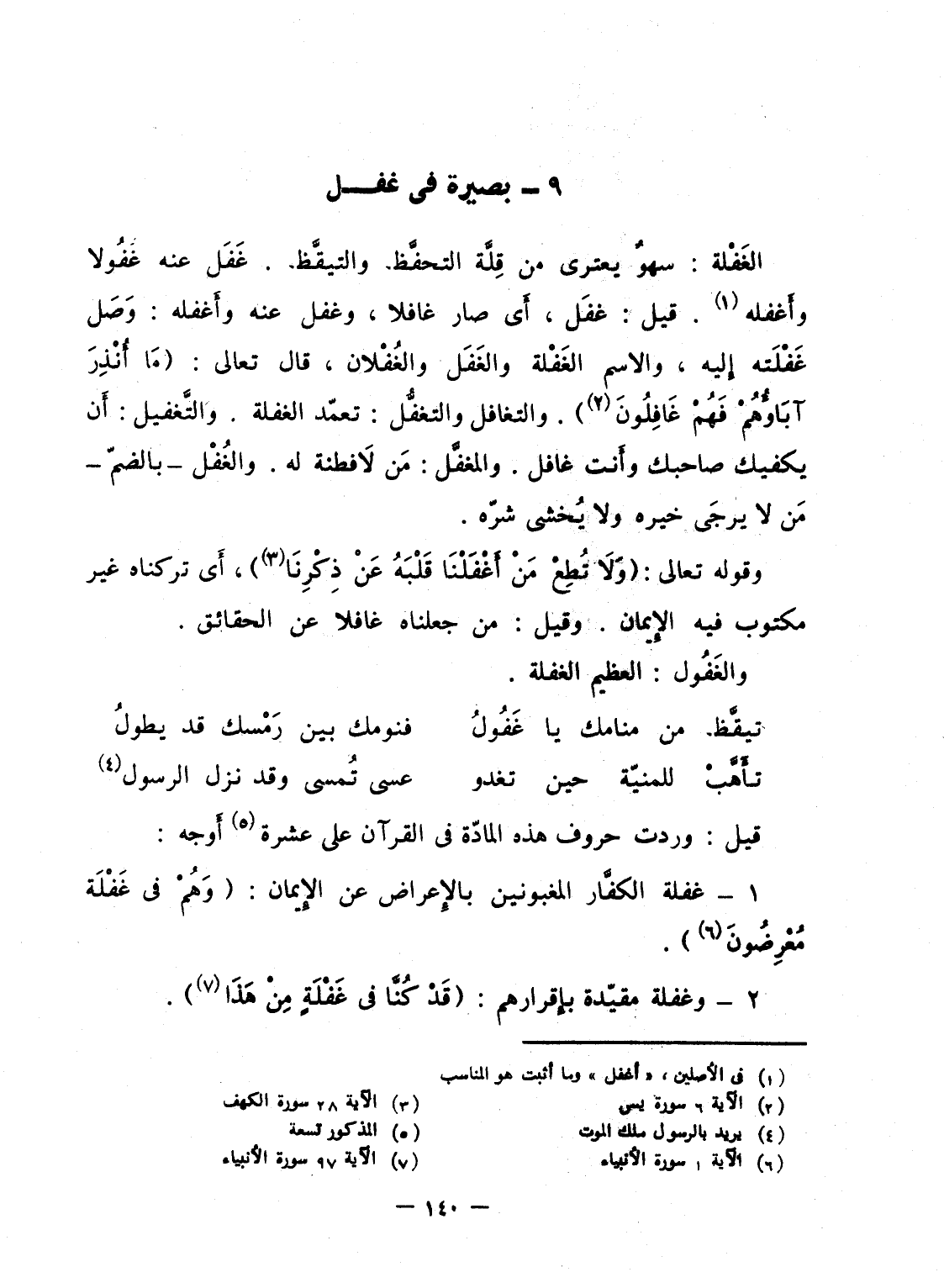 الغَفْلة: سهوٌ يعترى من قِلَّة التحفَّظ والتيقَّظ. غَفَل عنه غفُو وأَغفله. قيل: غفلَ، أَى صار غافلا، وغفل عنه وأَغفله: وَصَل غَفْلَته إِليه، والاسم الغَفْلة والغَفَل والغُفْلان، قال تعالى: {مَّآ أُنذِرَ آبَآؤُهُمْ فَهُمْ غَافِلُونَ} . والتغافل والتغفُّل: تعمّد الغفلة. والتَّغفيل: أَن يكفيك صاحبك وأَنت غافل. والمغفَّل: مَن لاَ فطنة له. والغُفْل - بالضمّ - مَن لا يرجىَ خيره ولا يُخشى شرّه.