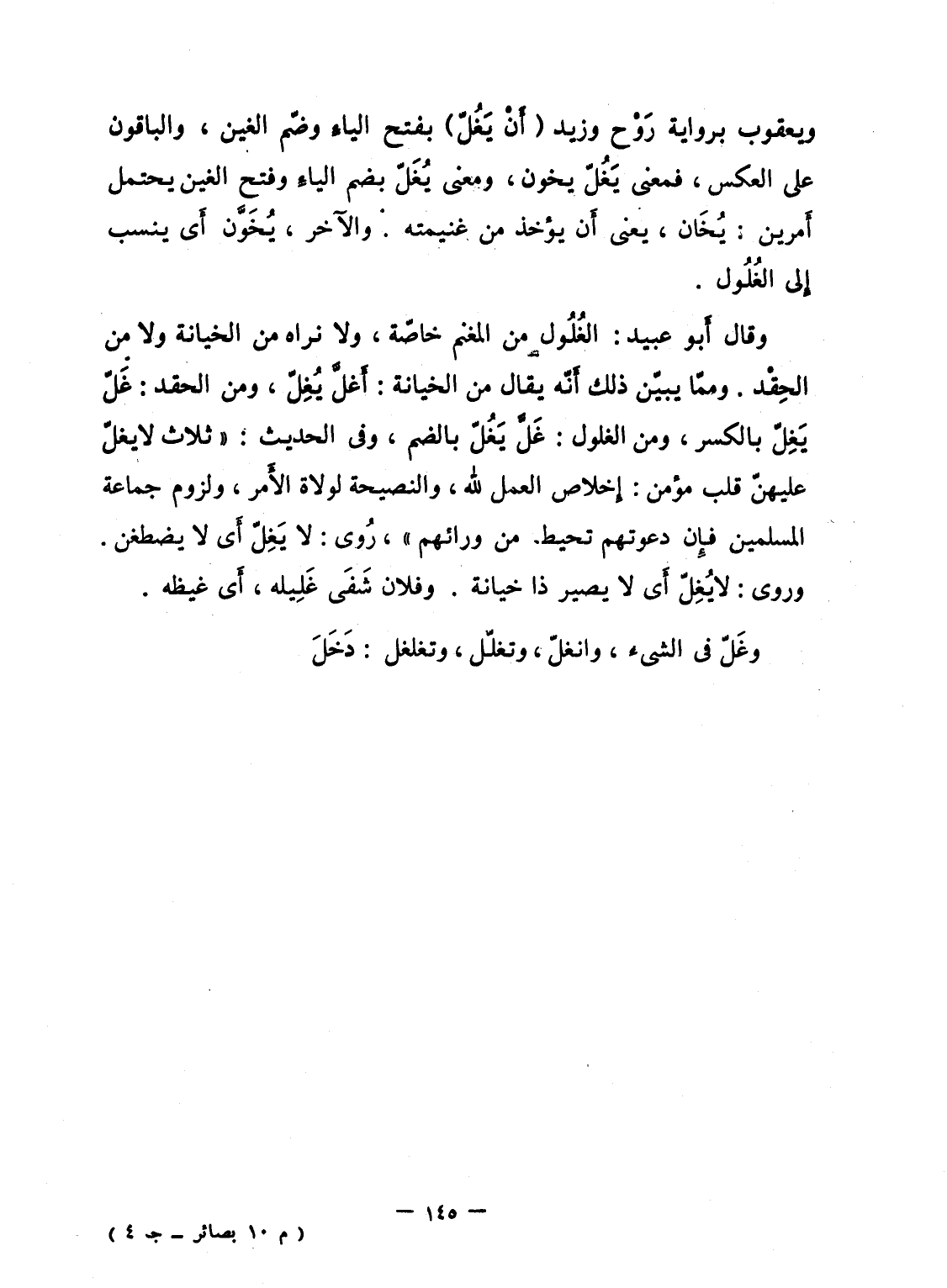 وقال أَبو عبيد: الغُلُول من المغنم خاصّة، ولا نراه من الخيانة ولا من الحِقْد. وممّا يبيّن ذلك أَنّه يقال من الخيانة: أَغلَّ يُغِلّ، ومن الحقد: غَلّ يَغِلّ بالكسر، ومن الغلول: غَلَّ يَغُلّ بالضم، وفى الحديث: "ثلاث لا يغلّ عليهنّ قلب مؤمن: إِخلاص العمل لله، والنصيحة لولاة الأَمر، ولزوم جماعة المسلمين فإِن دعوتهم تحيط من ورائهم"، رُوى: لا يَغِلّ أَى لا يضطغن. وروى: لا يُغِلّ أَى لا يصير ذا خيانة. وفلان شَفَى غَلِيله، أَى غيظه.