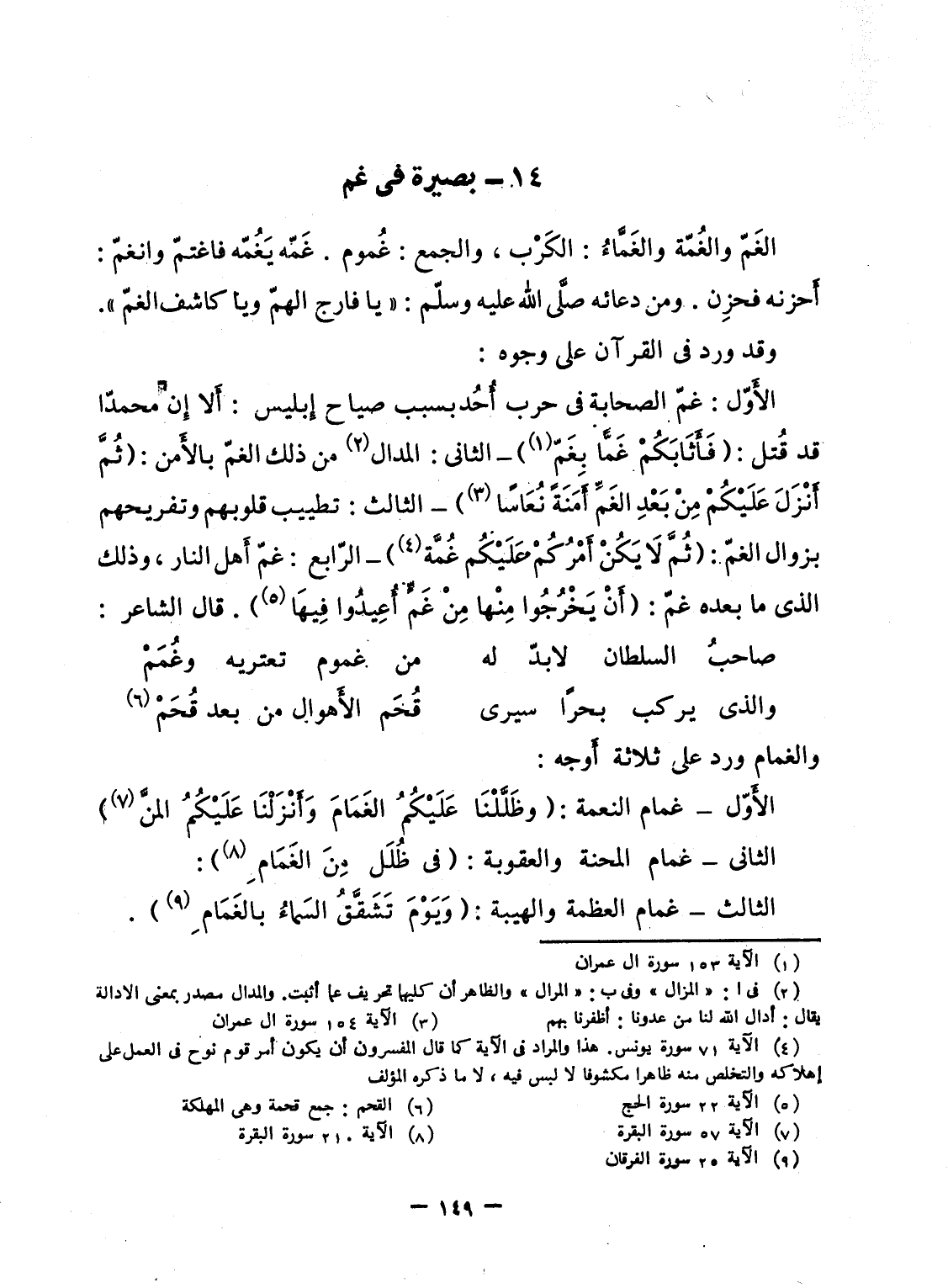 الأَوّل: غمّ الصحابة فى حرب أُحُد بسبب صياح إِبليس: أَلا إِن محمدّا قد قُتل: {فَأَثَابَكُمْ غَمّاًً بِغَمٍّ} - الثانى: المدال من ذلك الغمّ بالأَمن: {ثُمَّ أَنزَلَ عَلَيْكُمْ مِّن بَعْدِ الغم أَمَنَةً نُّعَاساً} - الثالث: تطييب قلوبهم وتفريحهم بزوال الغمّ: {ثُمَّ لاَ يَكُنْ أَمْرُكُمْ عَلَيْكُمْ غُمَّةً} - الرّابع: غمّ أَهل النار، وذلك الذى ما بعده غمّ: {أَن يَخْرُجُواْ مِنْهَا مِنْ غَمٍّ أُعِيدُواْ فِيهَا} . قال الشاعر: