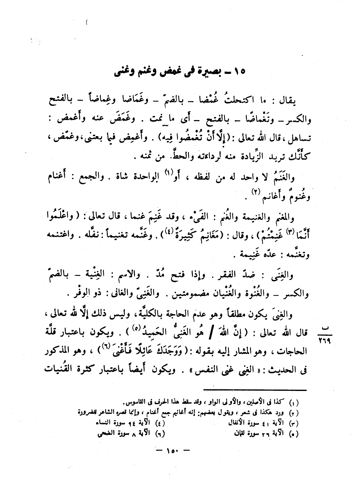 والغِنىَ يكون مطلقاً وهو عدم الحاجة بالكليَّة، وليس ذلك إِلاَّ لله تعالى، قال الله تعالى: {إِنَّ الله / هُوَ الغني الحميد} . ويكون باعتبار قلَّة الحاجات، وهو المشار إليه بقوله: {وَوَجَدَكَ عَآئِلاً فأغنى} ، وهو المذكور فى الحديث: "الغِنى غنى النفس". ويكون أَيضاً باعتبار كثرة القُنيات
