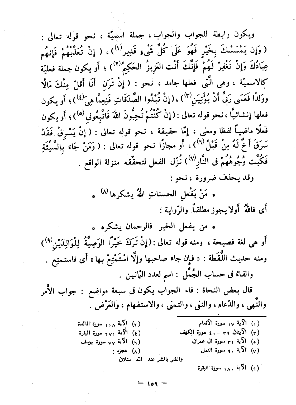 ويكون رابطة للجواب والجواب، جملة اسميّة، نحو قوله تعالى: {وَإِن يَمْسَسْكَ بِخَيْرٍ فَهُوَ على كُلِّ شَيْءٍ قَدُيرٌ} ، {إِن تُعَذِّبْهُمْ فَإِنَّهُمْ عِبَادُكَ وَإِن تَغْفِرْ لَهُمْ فَإِنَّكَ أَنتَ العزيز الحكيم} ؛ أَو يكون جملة فعليّة كالاسميّة، وهى الَّتى فعلها جامد، نحو: {إِن تَرَنِ أَنَاْ أَقَلَّ مِنكَ مَالاً وَوَلَداً فعسى رَبِّي أَن يُؤْتِيَنِ} ، {إِن تُبْدُواْ الصدقات فَنِعِمَّا هِيَ} ؛ أَو يكون فعلها إِنشائيَّا، نحو قوله تعالى: {إِن كُنتُمْ تُحِبُّونَ الله فاتبعوني} ؛ أَو يكون فعلاً ماضياً لفظا ومعنى، إِمّا حقيقة، نحو قوله تعالى: {إِن يَسْرِقْ فَقَدْ سَرَقَ أَخٌ لَّهُ مِن قَبْلُ} ، أَو مجازًا نحو قوله تعالى: {وَمَن جَآءَ بالسيئة فَكُبَّتْ وُجُوهُهُمْ فِي النار} نُزّل الفعل لتحقّقه منزلة الواقع.