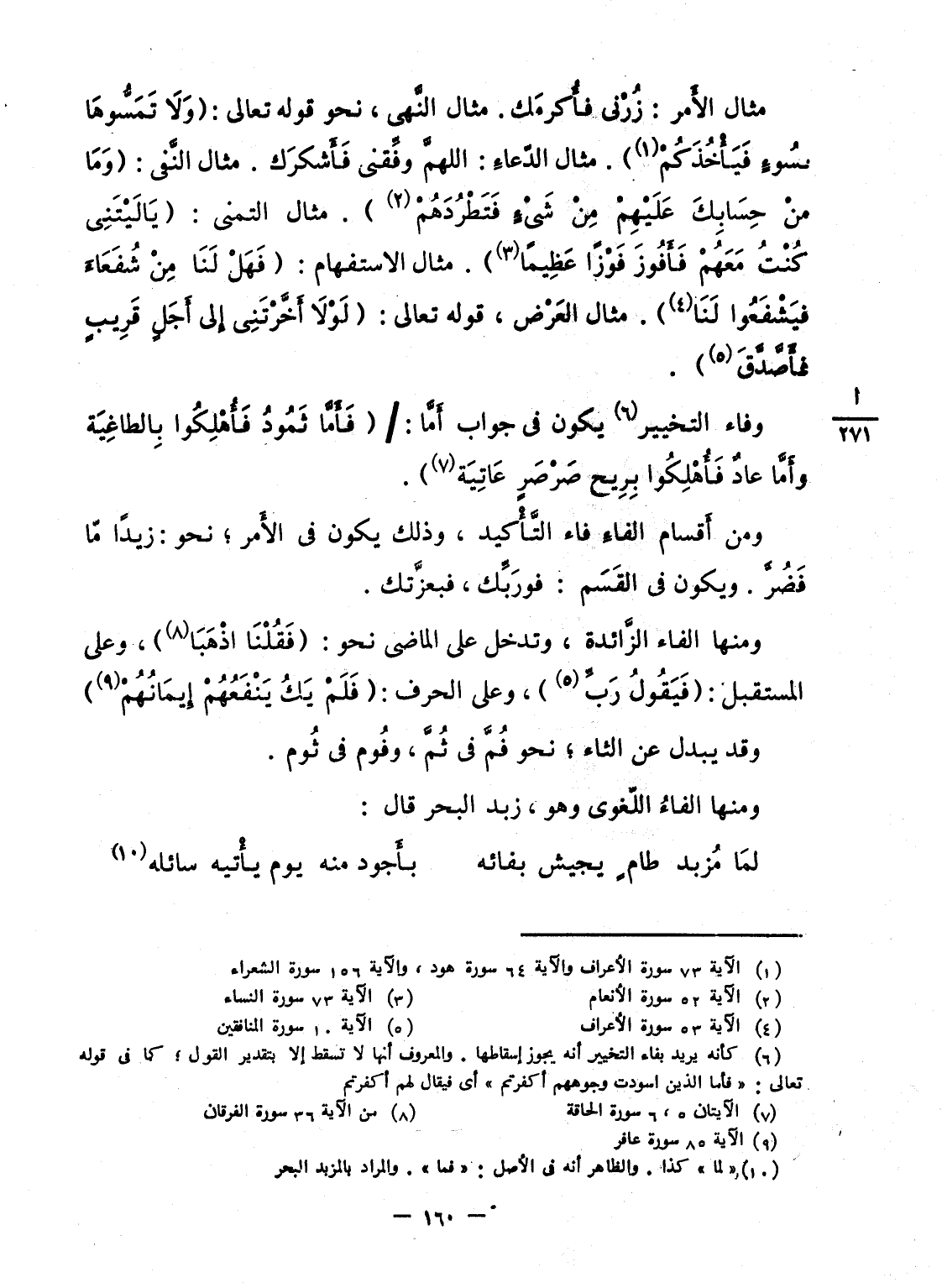 ومنها الفاء الزَّائدة، وتدخل على الماضى نحو: {فَقُلْنَا اذهبآ} ، وعلى المستقبل: {فَيَقُولُ رَبِّ} ، وعلى الحرف: {فَلَمْ يَكُ يَنفَعُهُمْ إِيمَانُهُمْ}