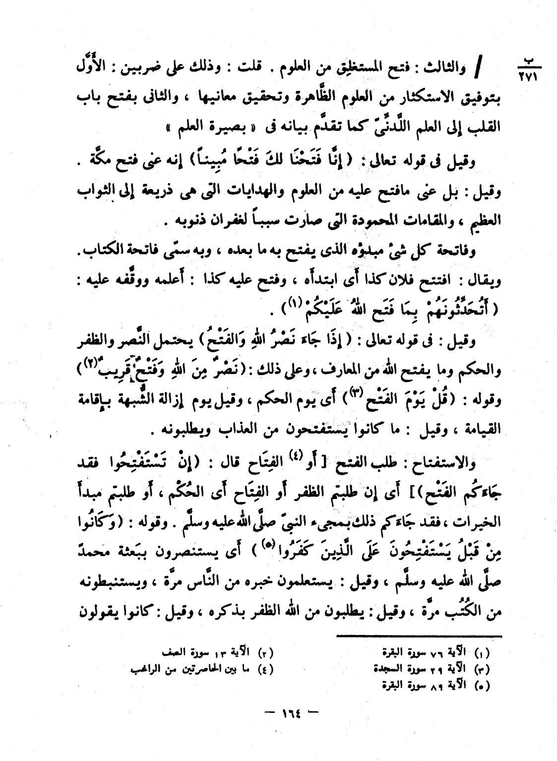 / والثالث: فتح المستغِلق من العلوم. قلت: وذلك على ضربين: الأَوَّل بتوفيق الاستكثار من العلوم الظَّاهرة وتحقيق معانيها، والثانى بفتح باب القلب إِلى العلم اللَّدنِّىّ كما تقدَّم بيانه فى "بصيرة العلم"