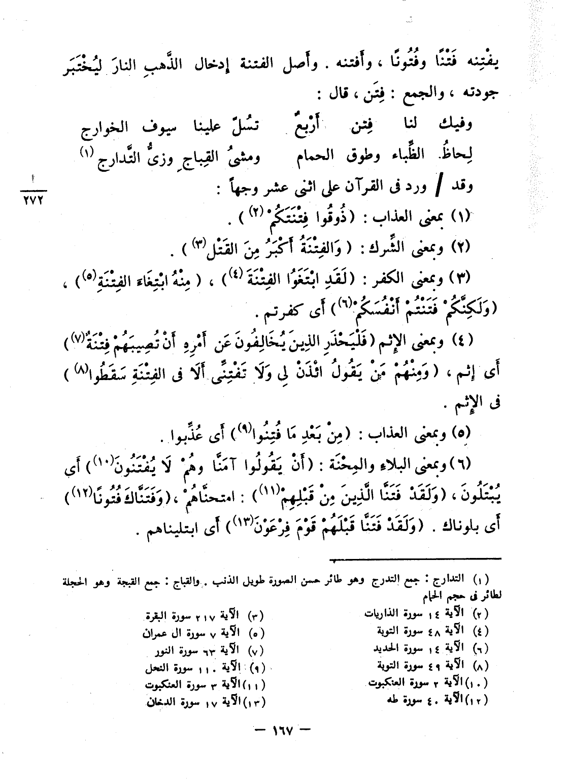 (3) وبمعنى الكفر: {لَقَدِ ابتغوا الفتنة} ، {مِنْهُ ابتغاء الفتنة} ، {ولاكنكم فَتَنتُمْ أَنفُسَكُمْ} أَى كفرتم.
