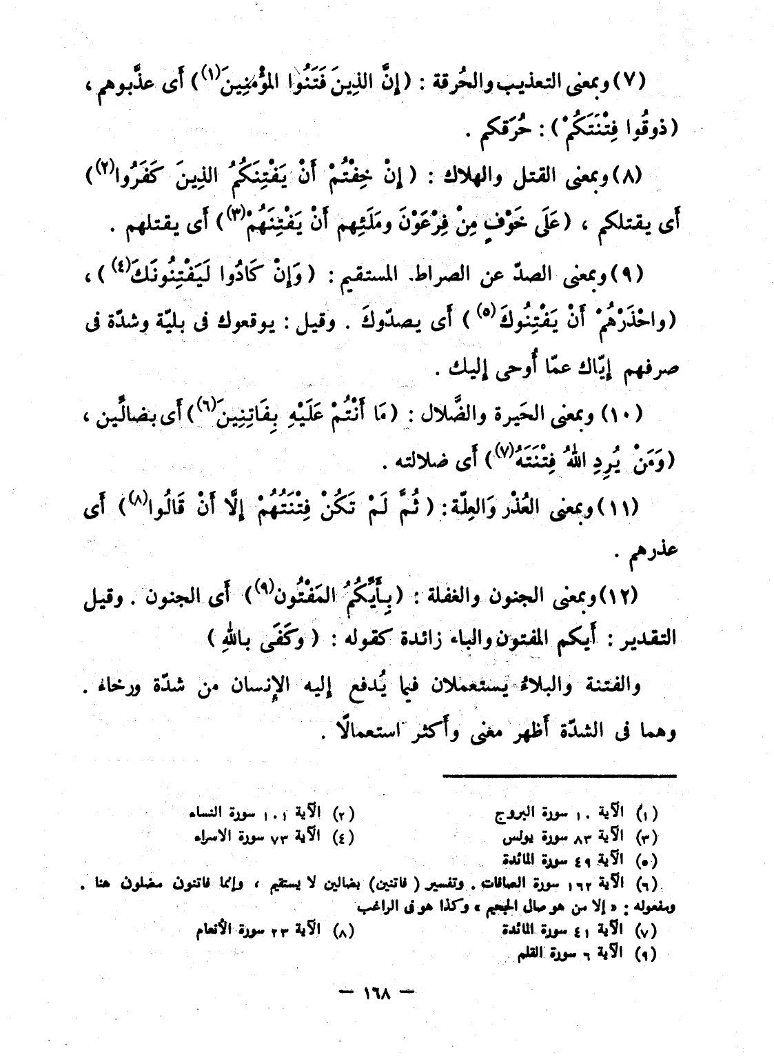 (8) وبمعنى القتل والهلاك: {إِنْ خِفْتُمْ أَن يَفْتِنَكُمُ الذين كفروا} أَى يقتلكم، {على خَوْفٍ مِّن فِرْعَوْنَ وَمَلَئِهِمْ أَن يَفْتِنَهُمْ} أَى يقتلهم.