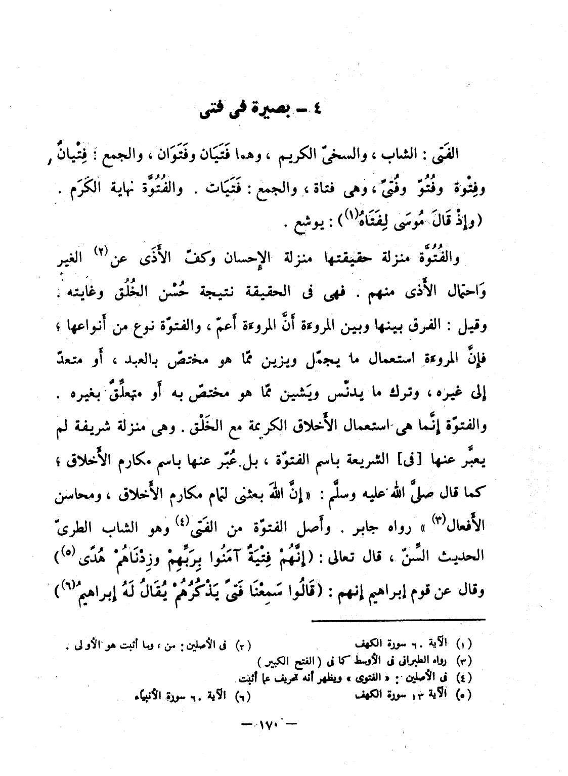 والفُتُوَّة منزلة حقيقتها منزلة الإِحسان وكفّ الأَذَى عن الغير وَاحتمال الأَذى منهم. فهى فى الحقيقة نتيجة حُسْن الخُلُق وغايته. وقيل: الفرق بينها وبين المروءَة أنَّ المروءَة أَعمّ، والفتوّة نوع من أَنواعها؛ فإِنَّ المروءَة استعمال ما يجمّل ويزين ممّا هو مختصّ بالعبد، أَو متعدّ إِلى غيره، وترك ما يدنّس ويَشين ممّا هو مختصّ به أَو متعلِّقٌ بغيره. والفتوّة إِنَّما هى استعمال الأَخلاق الكريمة مع الخَلْق. وهى منزلة شريفة لم يعبَّر عنها [فى] الشريعة باسم الفتوّة، بل عُبّر عنها باسم مكارم الأَخلاق؛ كما قال صلَّى الله عليه وسلَّم: "إِنَّ اللهَ بعثنى لتمام مكارم الأَخلاق، ومحاسن الأَفعال" رواه جابر. وأَصل الفتوّة من الفَتى وهو الشاب الطرىّ الحديث السِّنّ، قال تعالى: {إِنَّهُمْ فِتْيَةٌ آمَنُواْ بِرَبِّهِمْ وَزِدْنَاهُمْ هُدًى} وقال عن قوم إِبراهيم إِنهم: {قَالُواْ سَمِعْنَا فَتًى يَذْكُرُهُمْ يُقَالُ لَهُ إِبْرَاهِيمُ}