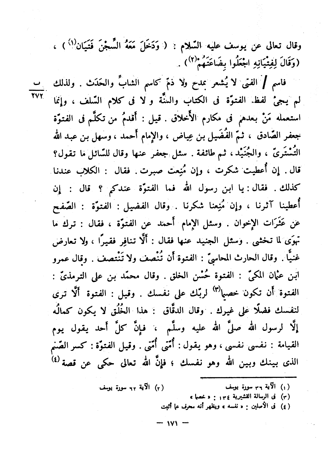 فاسم / الفتى لا يُشعر بمدح ولا ذمّ كاسم الشابِّ والحَدَث. ولذلك لم يجئ لفظ الفتوّة فى الكتاب والسنَّة ولا فى كلام السّلف، وإِنما استعمله مَنْ بعدهم فى مكارم الأَخلاق. قيل: أَقدمُ من تكلَّم فى الفتوّة جعفر الصّادق، ثمّ الفُضَيل بن عِياض، والإِمام أَحمد، وسهل بن عبد الله التُسْتَرىّ، والجُنَيْد، ثم طائفة. سئل جعفر عنها وقال للسّائل ما تقول؟ قال. إِن أُعطيت شكرت، وإِن مُنِعت صبرت. فقال: الكلاب عندنا كذلك. فقال: يا ابن رسول الله فما الفتوّة عندكم؟ قال: إِن أُعطينا آثرنا، وإِن مُنِعنا شكرنا. وقال الفضيل: الفتوّة: الصّفح عن عَثَرَات الإِخوان. وسئل الإِمام أَحمد عن الفتوّة، فقال، ترك ما تهوَى لما تخشى. وسئل الجنيد عنها فقال: أَلاَّ تنافِر فقيراً، ولا تعارض غنيًّا. وقال الحارث المحاسبىّ: الفتوة أَن تُنْصف ولا تَنْتصف. وقال عمرو ابن عثمان المكىّ: الفتوة حُسْن الخلق. وقال محمّد بن على الترمذىّ: الفتوة أَن تكون خصيماً لربّك على نفسك. وقيل: الفتوة أَلاَّ ترى لنفسك فضلاً على غيرك. وقال الدقَّاق: هذا الخُلُق لا يكون كمالُه إِلاَّ لرسول الله صلَّى الله عليه وسلَّم، فإِنَّ كلَّ أَحد يقول يوم القيامة: نفسى نفسى، وهو يقول: أُمّتى أُمّتى. وقيل الفتوّة: كسر الصّنم الذى بينك وبين الله وهو نفسك؛ فإِنَّ الله تعالى حكى عن قصة