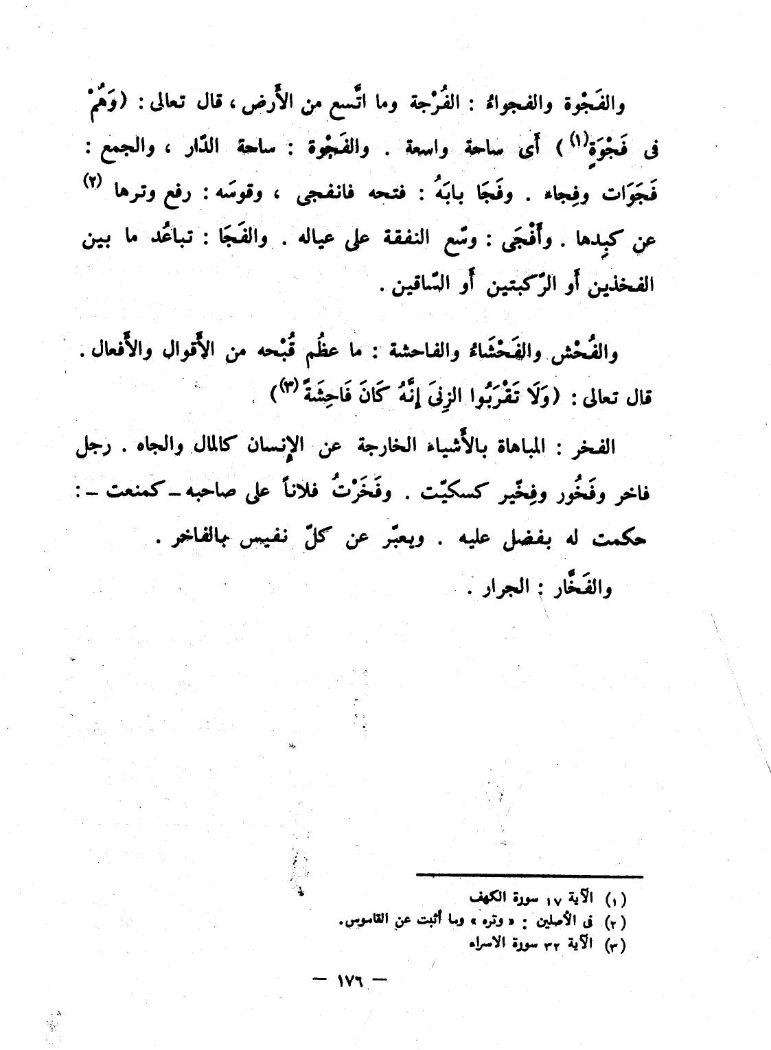والفَجْوة والفجواءُ: الفُرْجة وما اتَّسع من الأَرض، قال تعالى: {وَهُمْ فِي فَجْوَةٍ} أَى ساحة واسعة. والفَجْوة: ساحة الدّار، والجمع: فَجَوَات وفِجاء. وفَجَا بابَهُ: فتحه فانفجى، وقوسَه: رفع وترها عن كبِدها. وأَفْجَى: وسّع النفقة على عياله. والفَجَا: تباعُد ما بين الفخذين أَو الرّكبتين أَو السّاقين.
