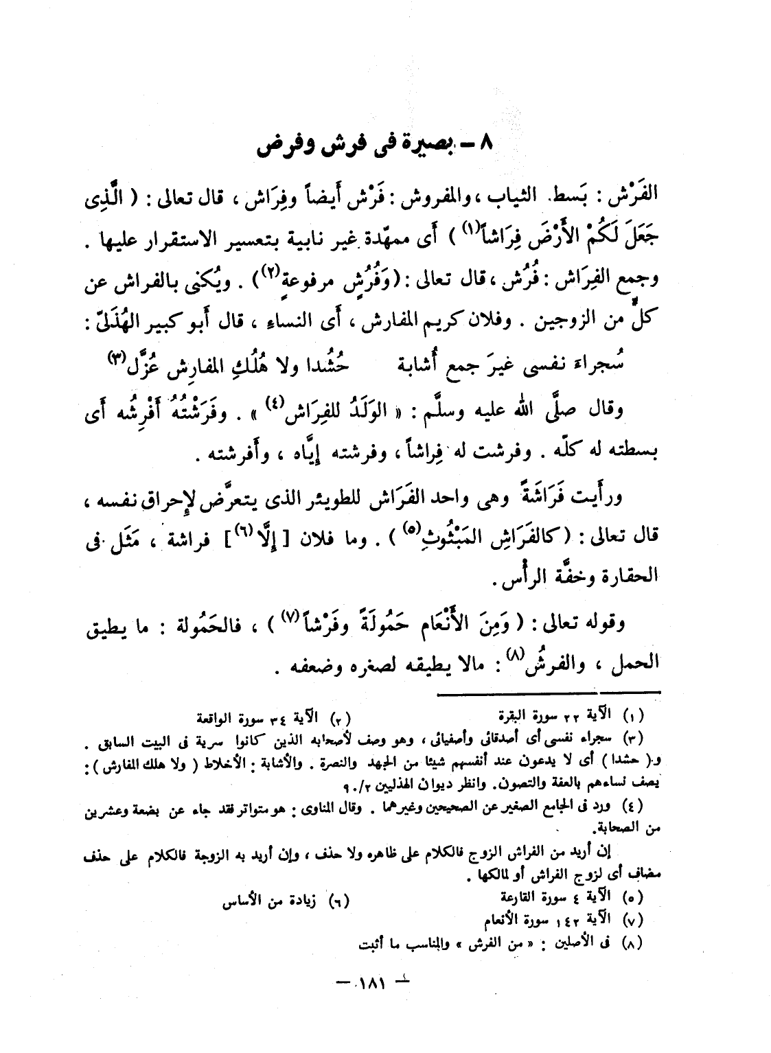 الفَرْش: بَسط الثياب، والمفروش: فَرْش أَيضاً وفِرَاش، قال تعالى: {الذي جَعَلَ لَكُمُ الأرض فِرَاشاً} أَى ممهّدة غير نابية بتعسير الاستقرار عليها. وجمع الفِرَاش: فُرُش، قال تعالى: {وَفُرُشٍ مَّرْفُوعَةٍ} . ويُكنى بالفراش عن كلٍّ من الزوجين. وفلان كريم المفارش، أَى النساءِ، قال أَبو كبير الهُذَلىّ: