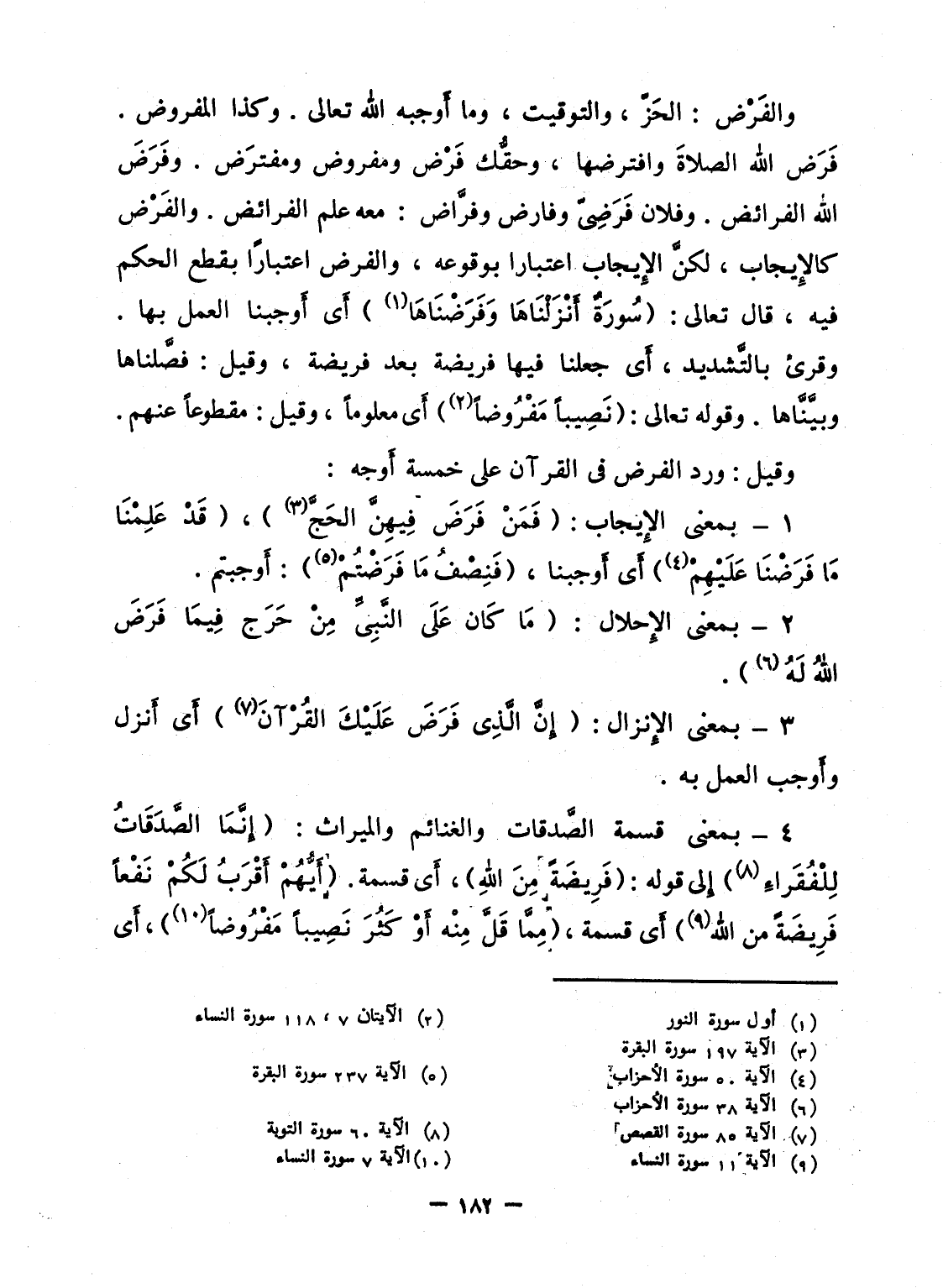 4- بمعنى قسمة الصَّدقات والغنائم والميراث: {إِنَّمَا الصدقات لِلْفُقَرَآءِ} إِلى قوله: {فَرِيضَةً مِّنَ الله} ، أَى قسمة. {أَيُّهُمْ أَقْرَبُ لَكُمْ نَفْعاً فَرِيضَةً مِّنَ الله} أَى قسمة، {مِمَّا قَلَّ مِنْهُ أَوْ كَثُرَ نَصِيباً مَّفْرُوضاً} ، أَى
