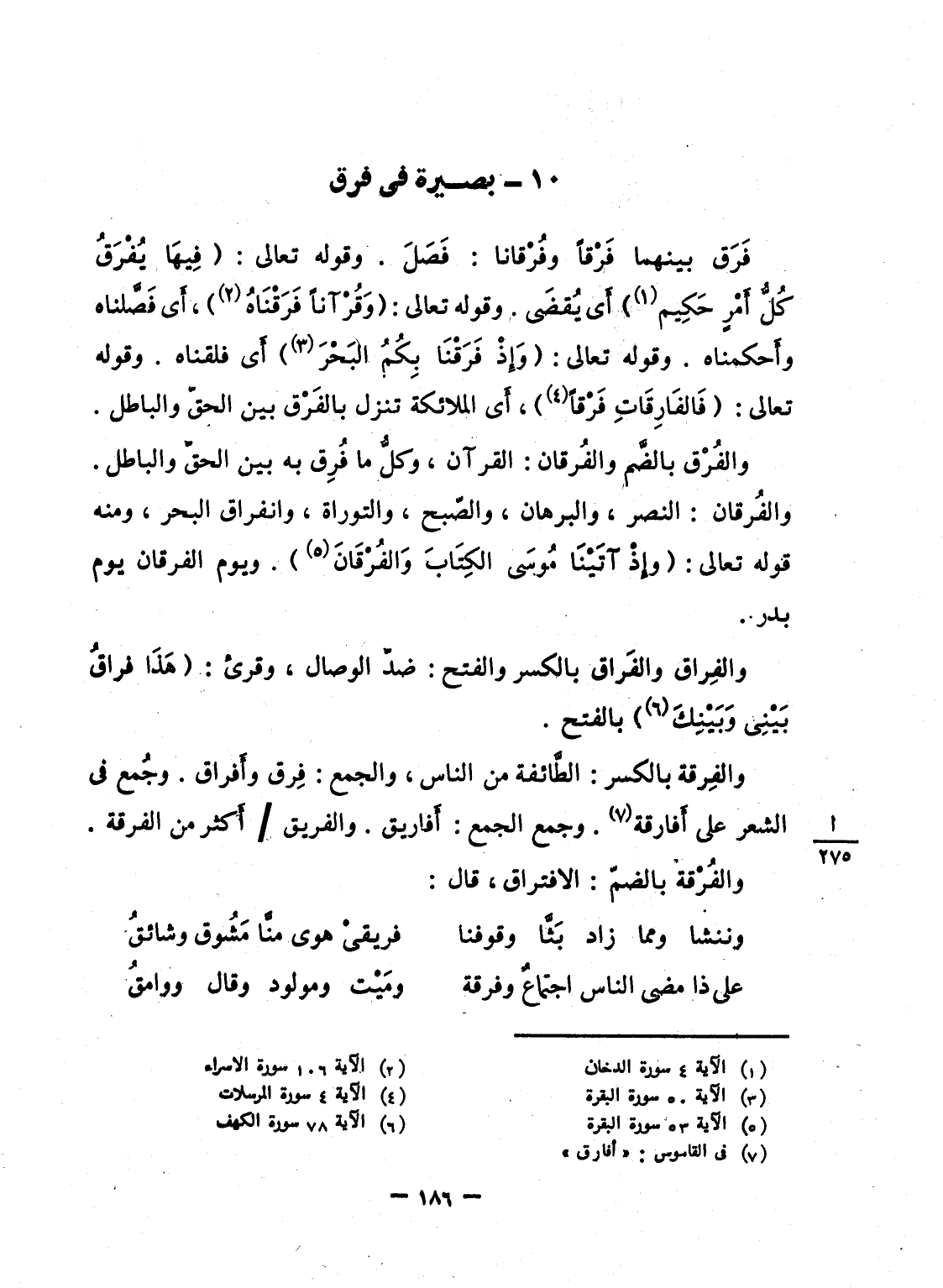 والفُرْق بالضَّم والفُرقان: القرآن، وكلُّ ما فُرِق به بين الحقّ والباطل. والفُرقان: النصر، والبرهان، والصّبح، والتوراة، وانفراق البحر، ومنه قوله تعالى: {وَإِذْ آتَيْنَا مُوسَى الكتاب والفرقان} . ويوم الفرقان يوم بدر.