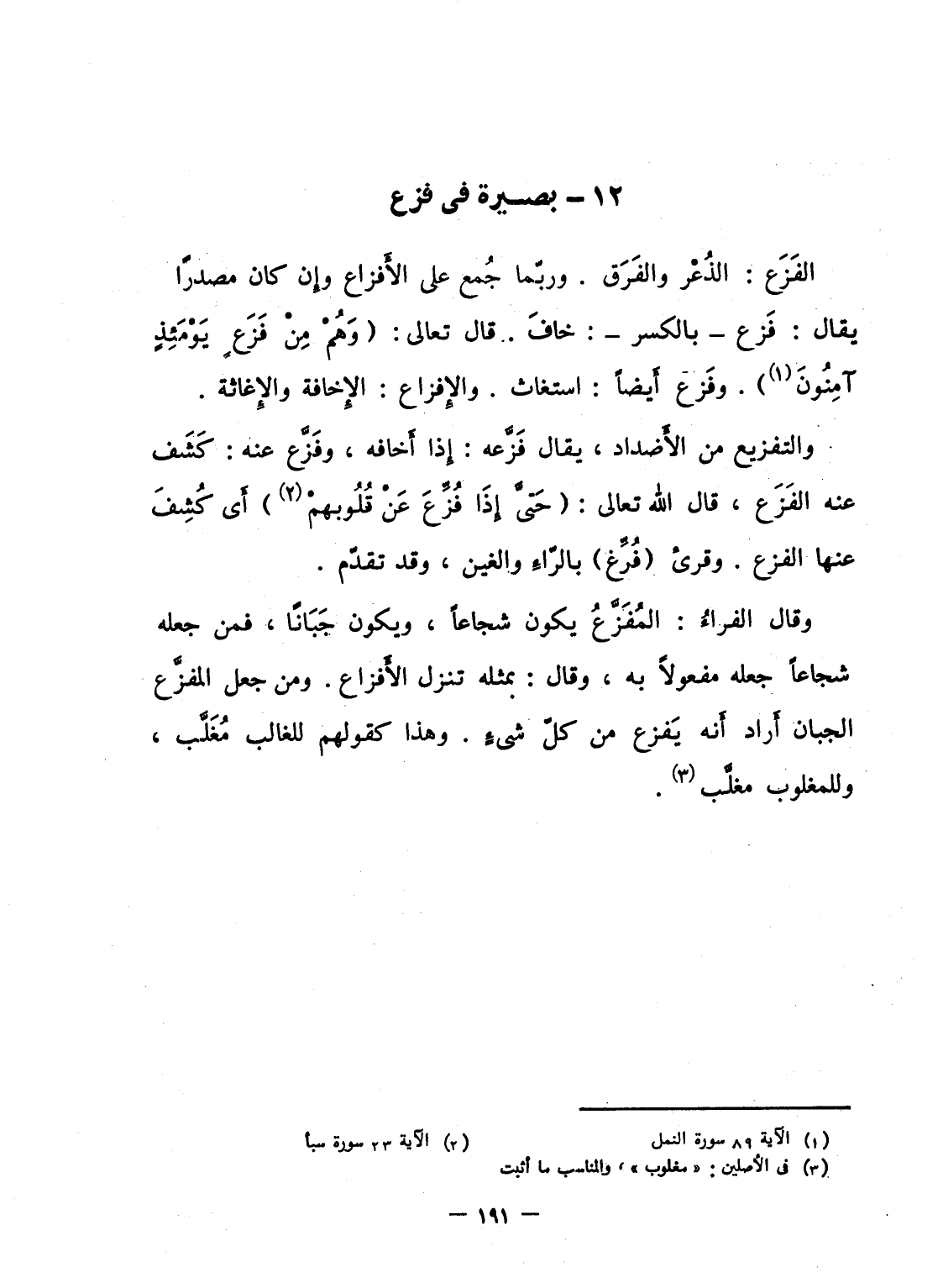 وقال الفراءُ: المُفَزَّعُ يكون شجاعاً، ويكون جَبَانًا، فمن جعله شجاعاً جعله مفعولاً به، وقال: بمثله تنزل الأَفزاع. ومن جعل المفزَّع الجبان أَراد أَنه يَفزع من كلّ شىءٍ. وهذا كقولهم للغالب مُغَلَّب، وللمغلوب مغلَّب.