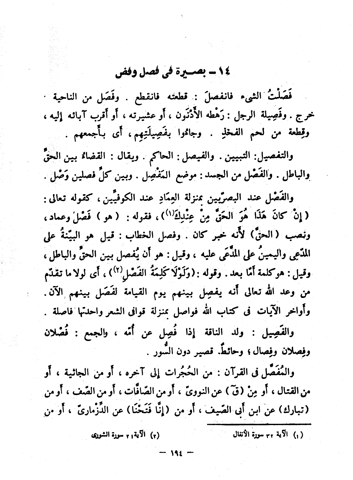 والفَصْل عند البصرّيين بمنزلة العِمَادِ عند الكوفيِّين، كقوله تعالى: {إِن كَانَ هاذا هُوَ الحق مِنْ عِندِكَ} ، فقوله: (هو) فَصْل وعماد، ونصب (الحقَّ) لأَنه خبر كان. وفصل الخطاب: قيل هو البيّنةُ على المدّعى واليمينُ على المدَّعَى عليه، وقيل: هو أَن يُفصل بين الحقِّ والباطل، وقيل: هو كلمة أَمّا بعد. وقوله: {وَلَوْلاَ كَلِمَةُ الفصل} ، أَى لولا ما تقدّم من وعد الله تعالى أَنه يفصِل بينهم يوم القيامة لفَصَل بينهم الآن. وأَواخر الآيات فى كتاب الله فواصل بمنزلة قوافى الشعر واحدتها فاصلة.