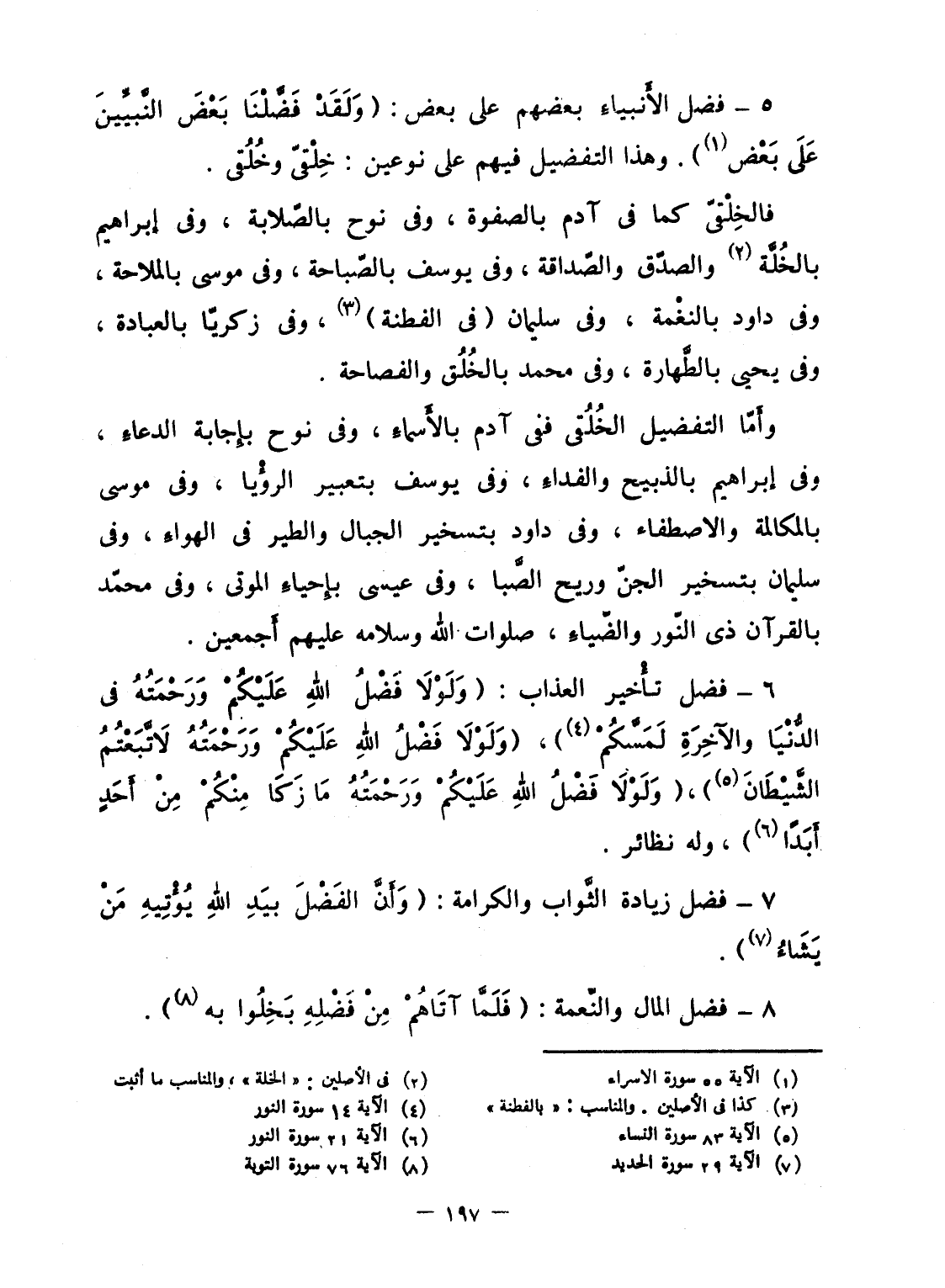 5- فضل الأَنبياءِ بعضهم على بعض: {وَلَقَدْ فَضَّلْنَا بَعْضَ النبيين على بَعْضٍ} . وهذا التفضيل فيهم على نوعين: خِلْقىّ وخُلُقى.