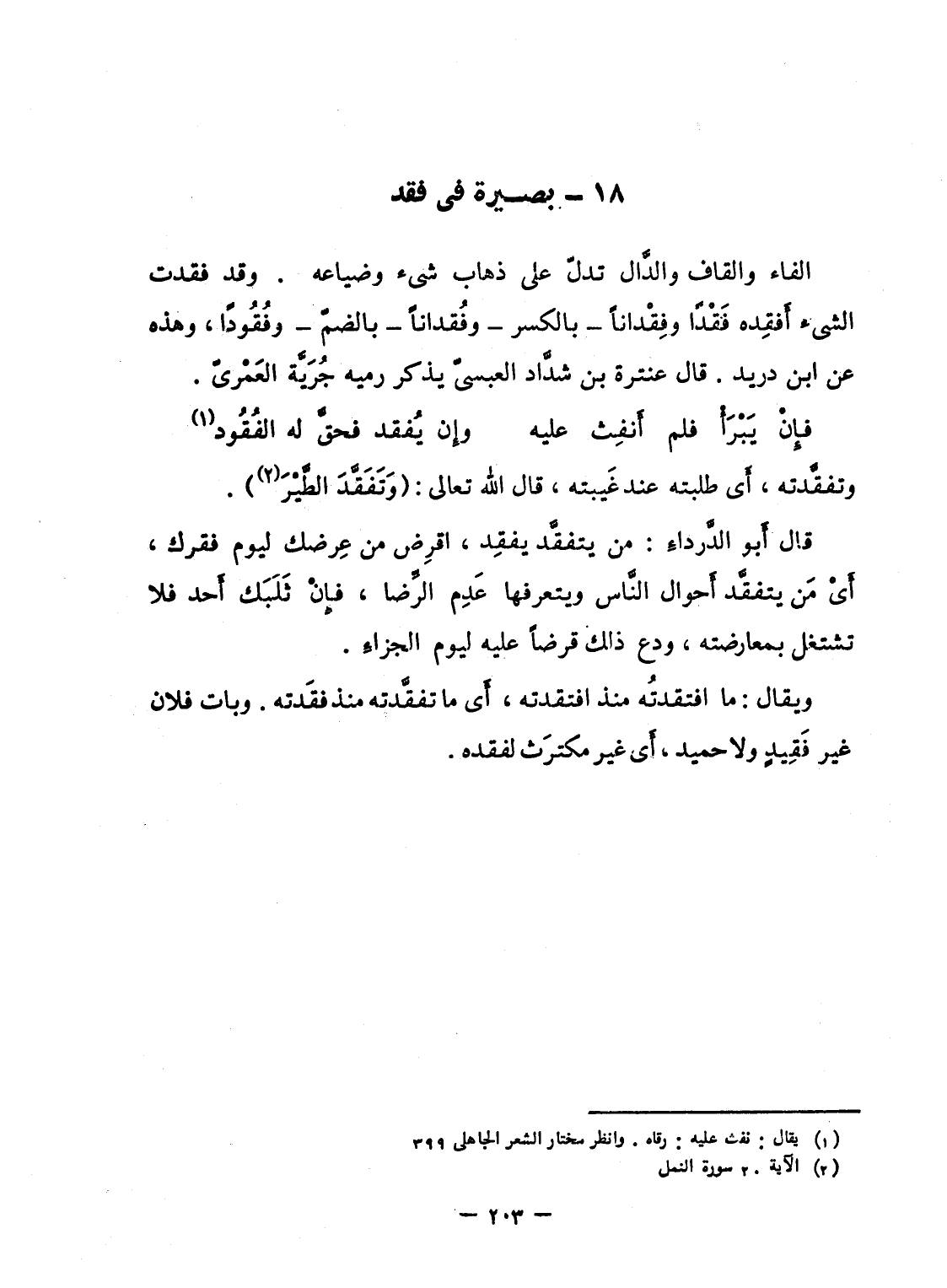 ويقال: ما افتقدتُه منذ افتقدته، أَى ما تفقَّدته منذ فقَدته. وبات فلان غير فَقِيدٍ ولا حميد، أَى غير مكترَث لفقده.